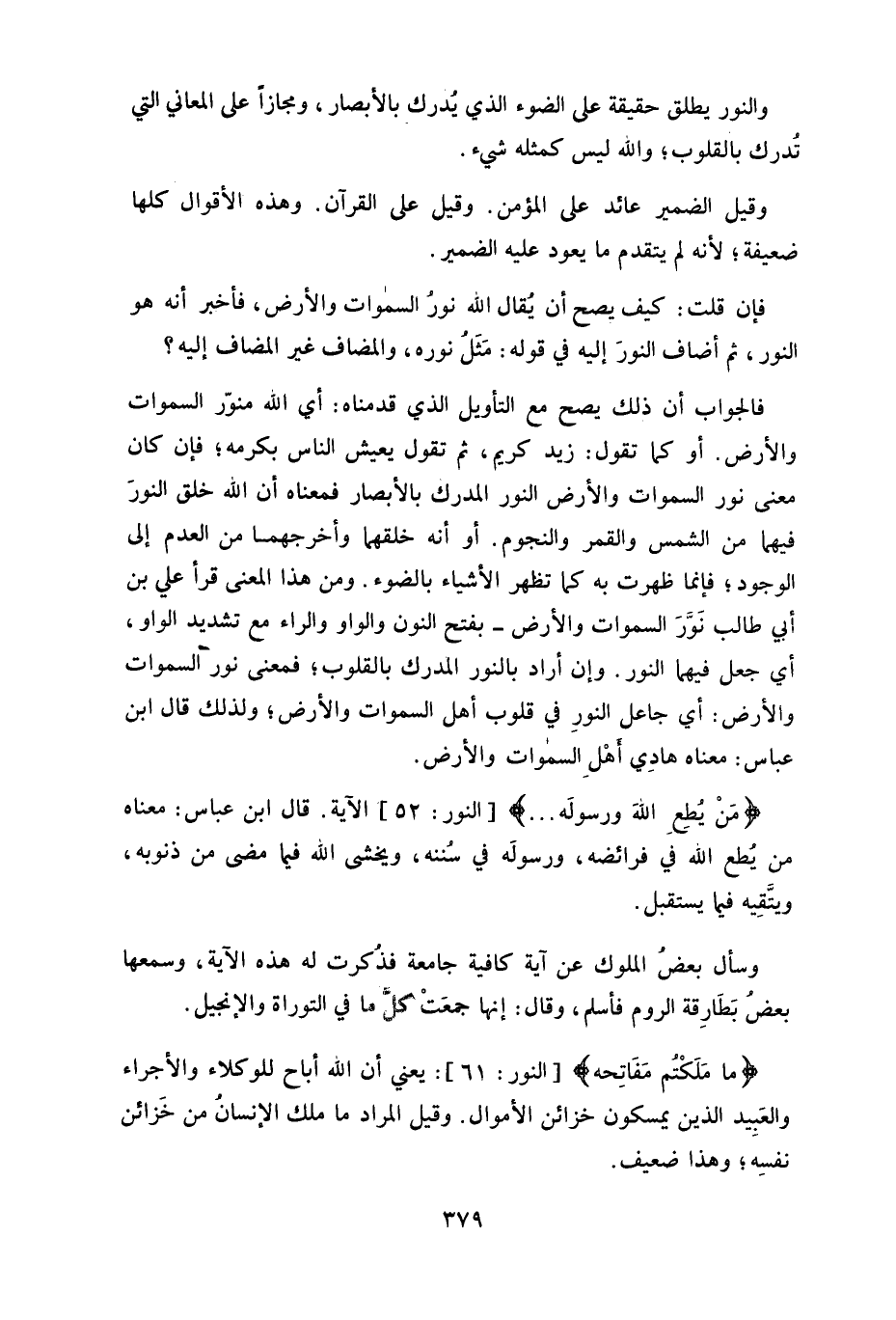 فإن قلت: كيف يصح أن يُقال (اللَّهُ نُورُ السَّمَاوَاتِ وَالْأَرْضِ) ، فأخبر أنه هو