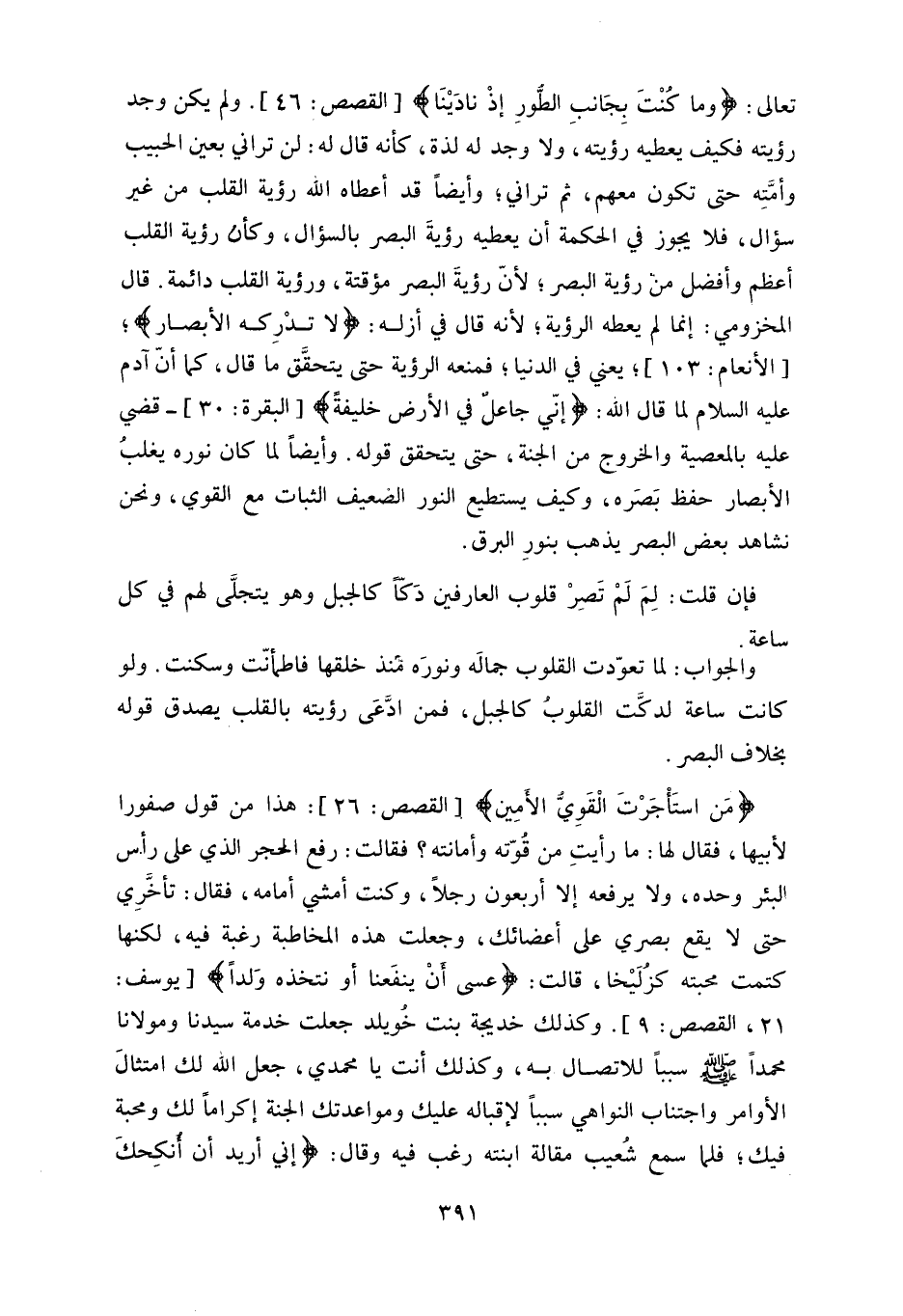 ولم يكن وجد رؤيته فكيف يعطيه رؤيته، ولا وجد له لذة، كأنه قال له: لن تراني بعين الحبيب وأمَّتِه حتى تكون معهم، ثم تراني، وأيضاً قد أعطاه الله رؤية القلب من غير سؤال، فلا يجوز في الحكمة أن يعطيه رؤيةَ البصر بالسؤال، وكأنَّ رؤية القلب أعظم وأفضل من رؤية البصر، لأنَّ رؤيةَ البصر مؤقتة، ورؤية القلب دائمة.