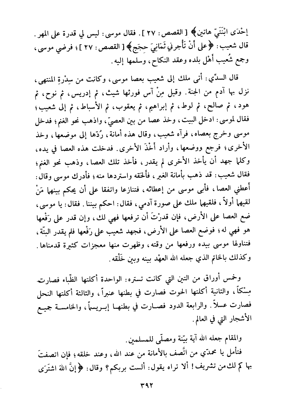 فقال: يا موسى، ضع العصا على الأرض، فإن قدرْتَ أن ترفعها فهي لك، وإن قدر على رَفْعها هو فهي له، فوضع العصا على الأرض، فجهد شعيب على رَفْعها فلم يقدر ألبتَّة، فتناولها موسى بيده ورفعها من وقته، وظهرت منها معجزات كثيرة قدمناها (1) .