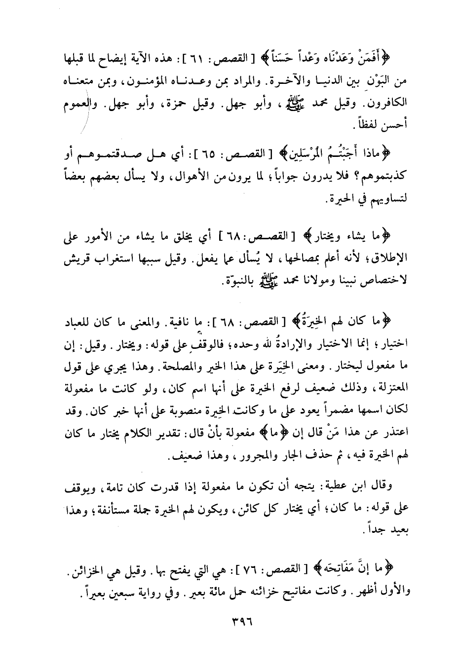 وقد اعتذر عن هذا مَنْ قال إن (ما) مفعولة بأنْ قال: تقدير الكلام يختار ما كان لهم (الخِيَرة) فيه، ثم حذف الجار والمجرور، وهذا ضعيف.
