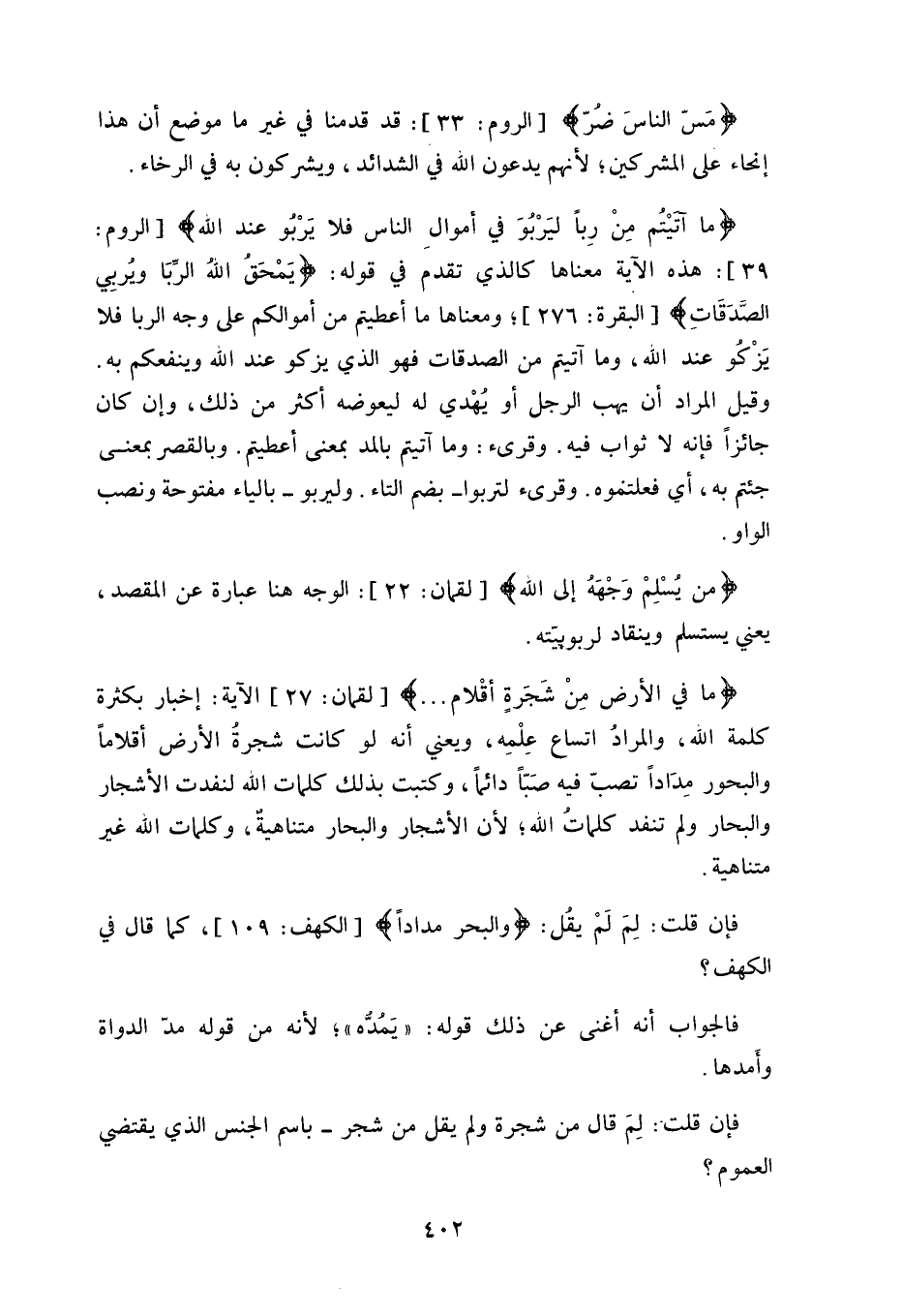 هذه الآية معناها كالذي تقدم في قوله: (يَمْحَق اللَّهُ الرِّبَا ويربِي الصَّدَقَاتِ) ، ومعناها ما أعطيتم من أموالكم على وجه الربا فلا يَزْكُو عند الله، وما آتيتم من الصدقات فهو الذي يزكو عند الله وينفعكم به.