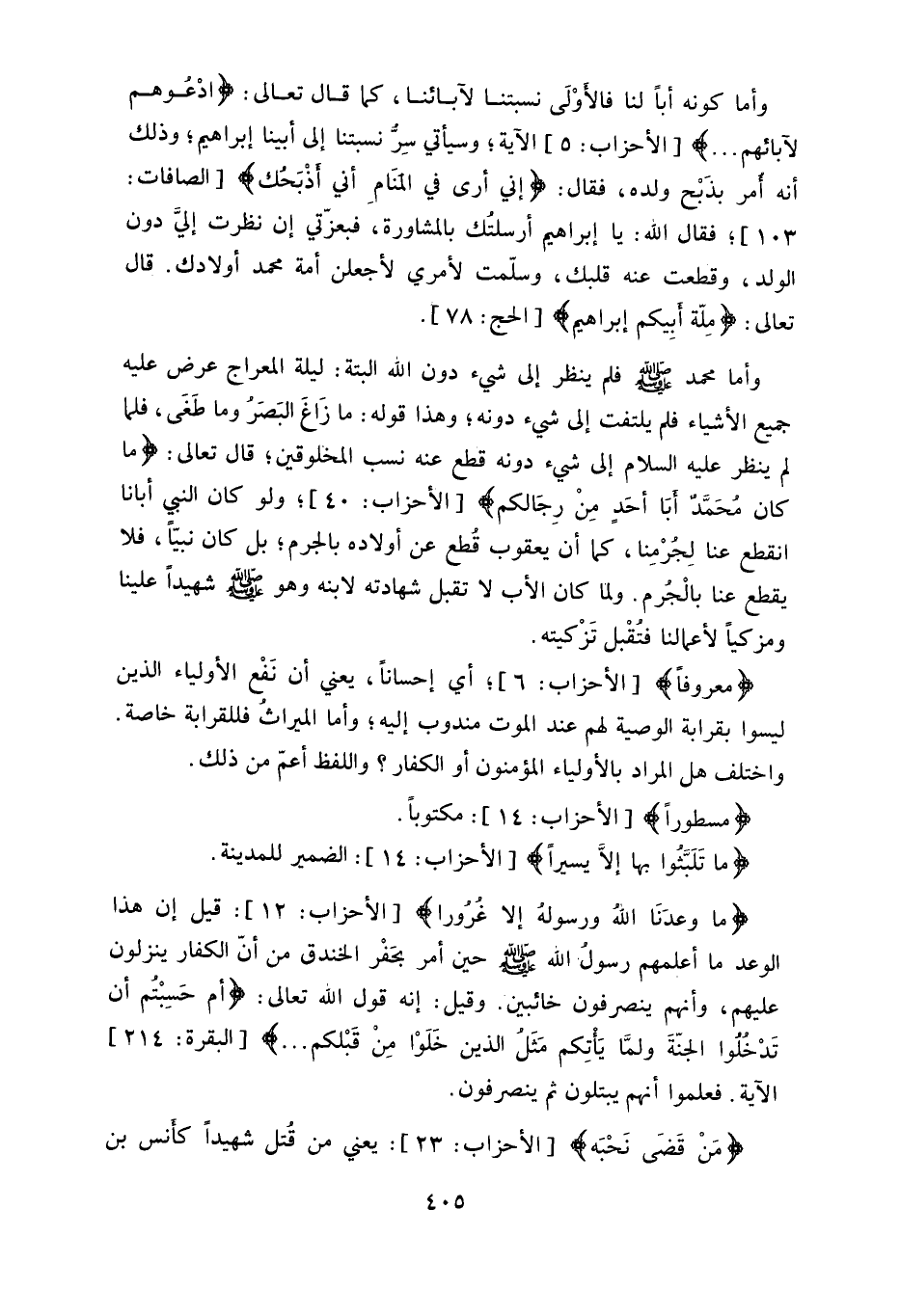 وأما محمد - صلى الله عليه وسلم - فلم ينظر إلى شيء دون الله ألبتة: ليلة المعراج عرض عليه جميع الأشياء فلم يلتفت إلى شيء دونه، وهذا قوله: (ما زَاغَ البَصَر وما طَغَى) ، فلما لم ينظر عليه السلام إلى شيء دونه قطع عنه نسب المخلوقين، قال تعالى: (مَا كَانَ مُحَمَّدٌ أَبَا أَحَدٍ مِنْ رِجَالِكُمْ) ، ولو كان النبي أبانا انقطع عنا لجُرْمِنا، كما أن يعقوب قطع عن أولاده بالجرم، بل كان نبيّاً، فلا يقطع عنا بالْجرم.