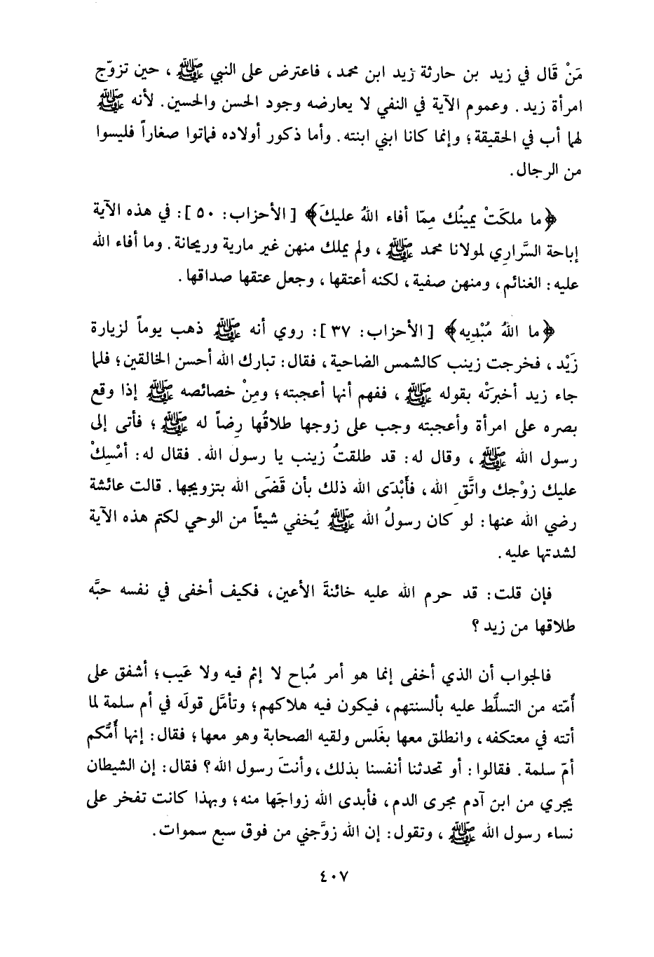 زَيْد، فخرجت زينب كالشمس الضاحية، فقال: تبارك الله أحسن الخالقين، فلما جاء زيد أخبرته بقوله - صلى الله عليه وسلم -، ففهم أنها أعجبته، ومِنْ خصائصه - صلى الله عليه وسلم - إذا وقع بصره على امرأة وأعجبته وجب على زوجها طلاقها رِضاً له - صلى الله عليه وسلم -، فأتى إلى