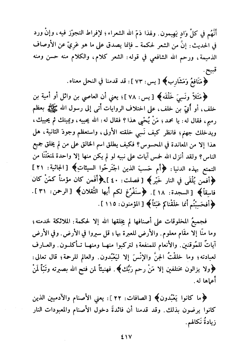 رميم، فقال له: يا محمد، مَنْ يُحْيى هذا؟ فقال له: الله يحييه، ويميتك ثم يحييك، ويدخلك جهنم، فانظر كيف نَسِي خلقته الأولى، واستعظم وجودَ الثانية، هل هذا إلا من المعاندة في المحسوس، فكيف يطلق اسم الخالق على من لم يخلق جميع الناس، ولقد أنزل الله خمس آيات على نبيه لو لم يكن منها إلا واحدة لمنعَتْنَا من التمتع بهذه الدنيا: (أَمْ حَسِبَ الَّذِينَ اجْتَرَحُوا السَّيِّئَاتِ أَنْ نَجْعَلَهُمْ كَالَّذِينَ آمَنُوا وَعَمِلُوا الصَّالِحَاتِ سَوَاءً مَحْيَاهُمْ وَمَمَاتُهُمْ سَاءَ مَا يَحْكُمُونَ (21) .