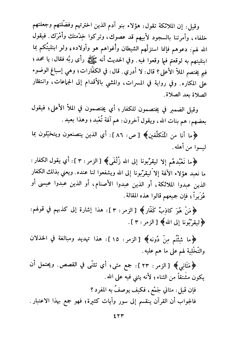 وقيل الضمير في يختصمون للكفار، أي يختصمون في الملأ الأعلى، فيقول