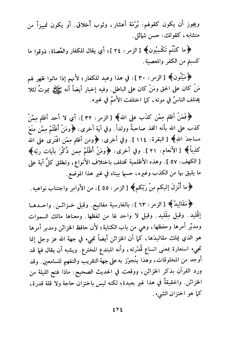 ومعناها مالك السماوات ومدبِّر أمرها وحفظها، وهي من باب الكناية، لأن حافظ الخزائن ومدبر أمرها هو الذي يملك مقاليدَها، كما أن الخزائن أيضاً تجيء في جهة الله عز وجل إنما تجيء استعارة بمعنى اتساع قدْرته، وأنه المبتدع المخترع.