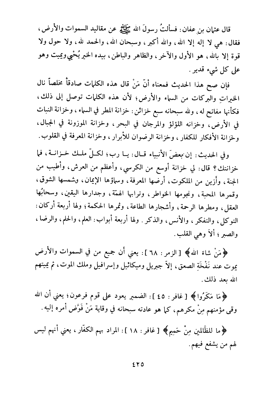 قال عثمان بن عفان: فسألت رسولَ الله - صلى الله عليه وسلم - عن مقاليد السماوات والأرض، فقال: هي لا إله إلا الله، والله أكبر، وسبحان الله، والحمد لله، ولا حول ولا قوة إلا بالله، هو الأول والآخر، والظاهر والباطن، بيده الخير يحْيي ويميت وهو على كل شيء قدير.