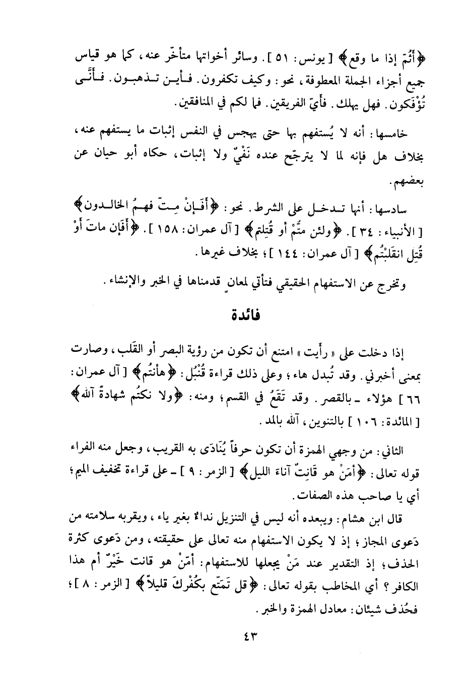 دَعوى المجاز، إذ لا يكون الاستفهام منه تعالى على حقيقته، ومن دَعوى كثرة الحذف، إذ التقدير عند مَنْ يجعلها للاستفهام: أمّنْ هو قانت خَيْرٌ أم هذا الكافر، أي المخاطب بقوله تعالى: (قل تَمَتّع بكفْركَ قليلاً) .
