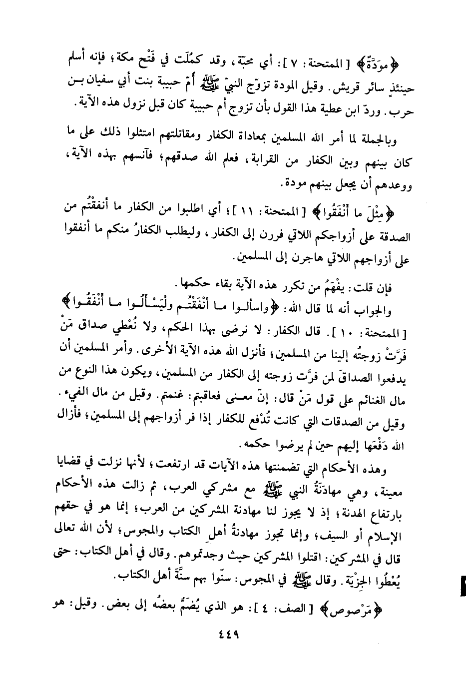 معينة، وهي مهادَنةُ النبي - صلى الله عليه وسلم - مع مشركي العرب، ثم زالت هذه الأحكام بارتفاع الهدنة، إذ لا يجوز لنا مهادنة المشركين من العرب، إنما هو في حقهم الإسلام أو السيف، وإنما تجوز مهادنةُ أهلِ الكتاب والمجوس، لأن الله تعالى قال في المشركين: (اقتلوا المشركين حيث وجدتموهم) .