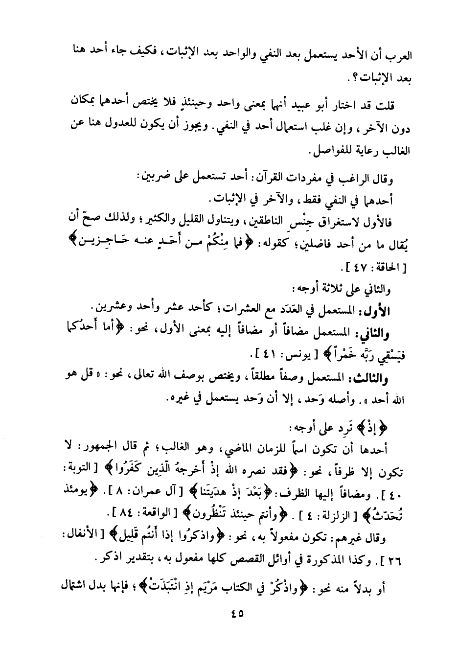 وقال الراغب في مفردات القرآن: أحد تستعمل على ضربين:
