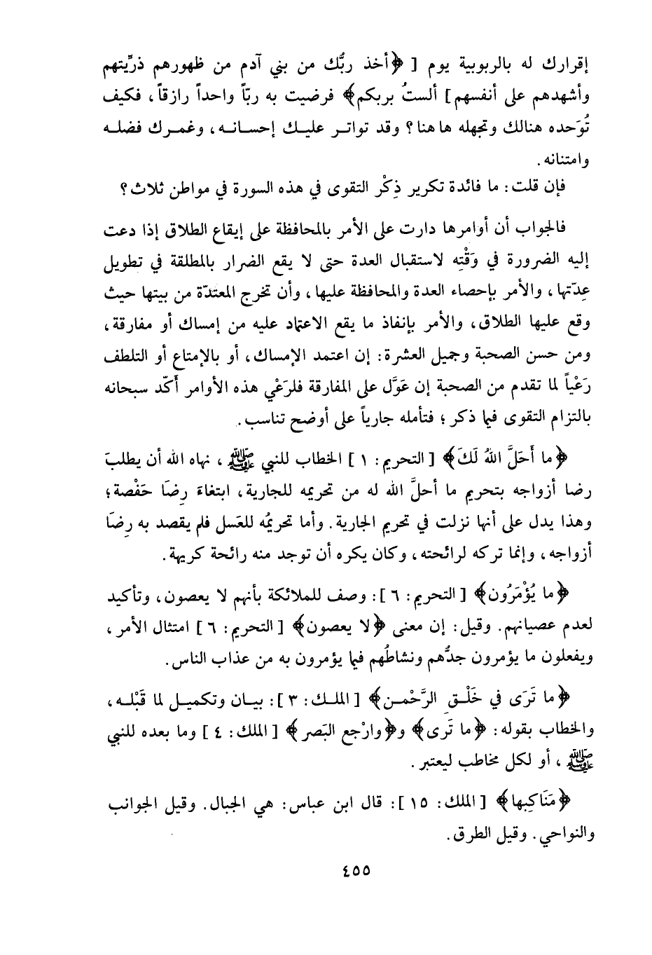 عِدّتها، والأمر بإحصاء العدة والمحافظة عليها، وأن تخرج المعتدة من بيتها حيث وقع عليها الطلاق، والأمر بإنفاذ ما يقع الاعتماد عليه من إمساك أو مفارقة، ومن حسن الصحبة وجميل العشرة: إن اعتمد الإمساك، أو بالإمتاع أو التلطف رَعْياً لما تقدم من الصحبة إن عَوَّل على المفارقة فلرَعْي هذه الأوامر أكّد سبحانه بالتزام التقوى فيما ذكر، فتأمله جارياً على أوضح تناسب.