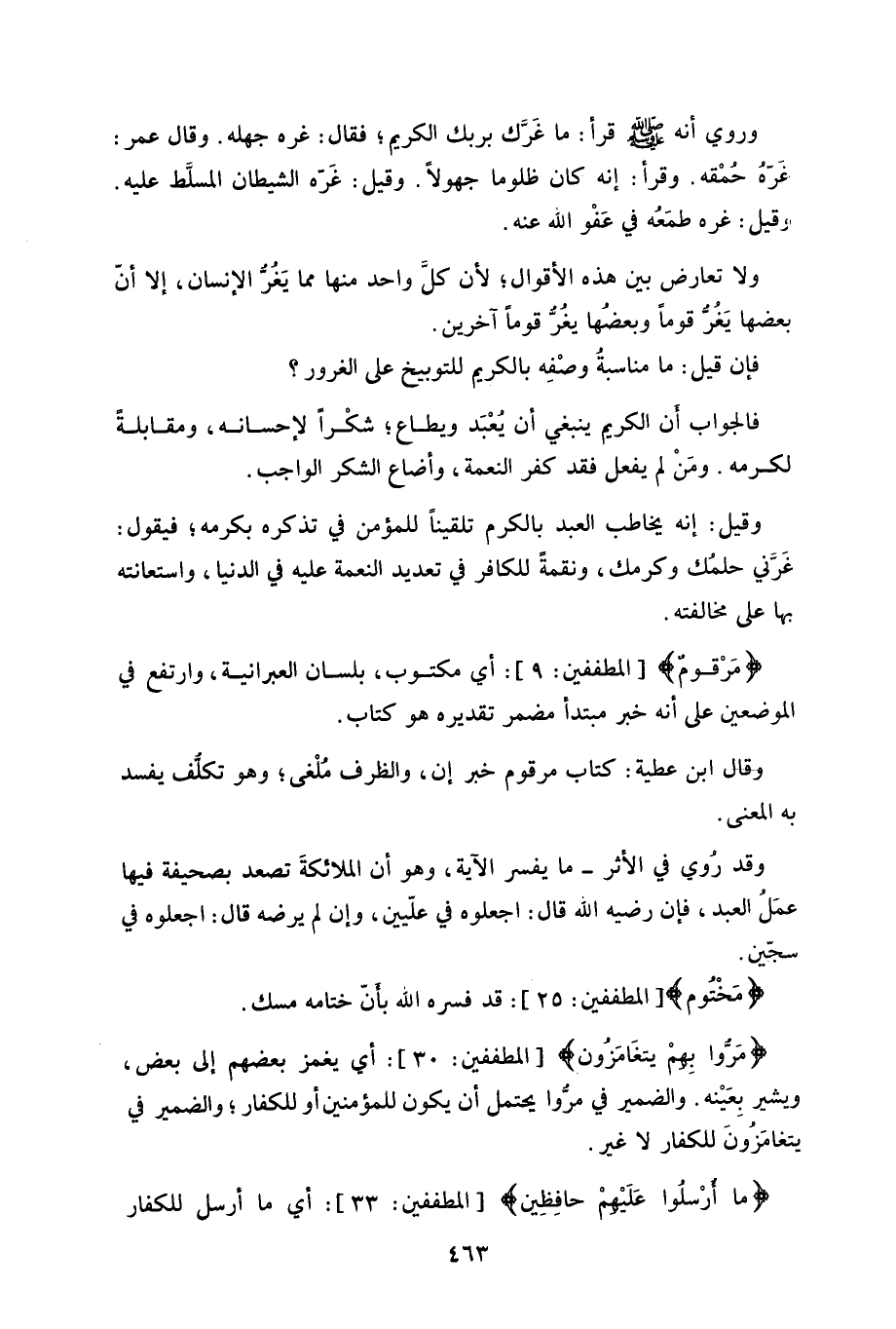 وروي أنه - صلى الله عليه وسلم - قرأ: (ما غَرَّك بربك الكريم) ، فقال: غره جهله.