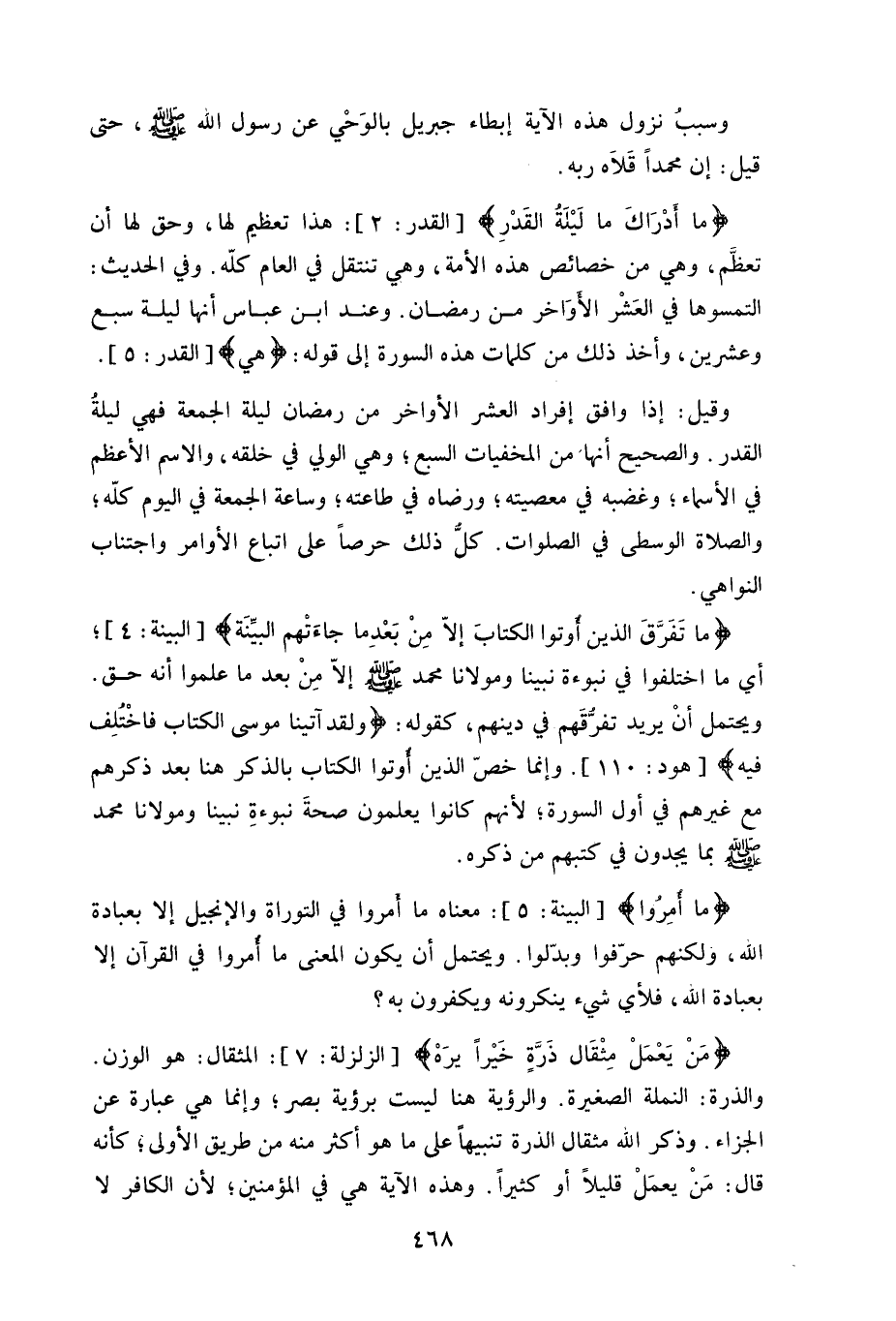 وعند ابن عباس أنها ليلة سبع وعشرين، وأخذ ذلك من كلمات هذه السورة إلى قوله: (هي) القدر.