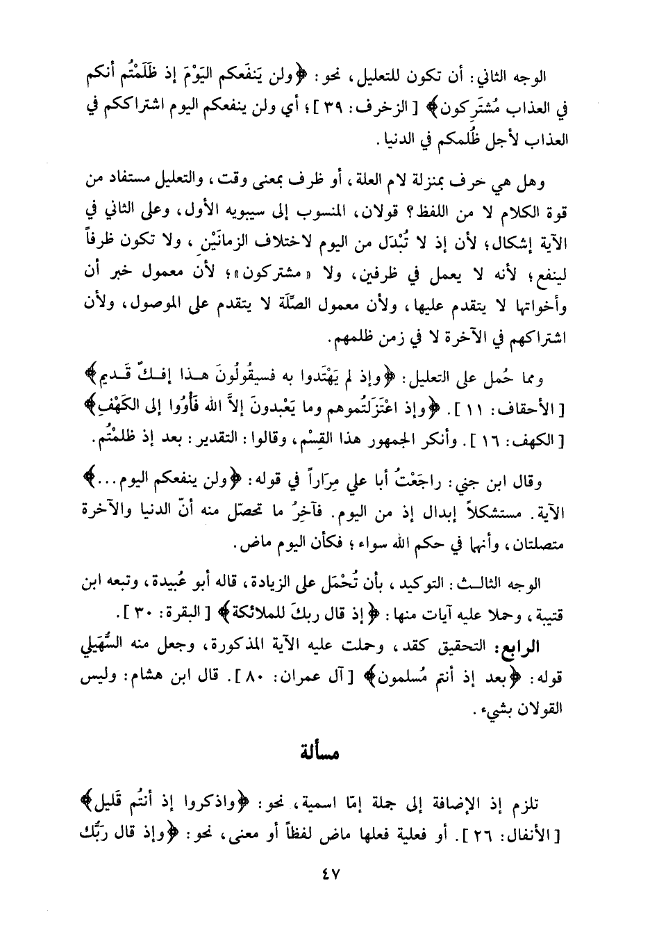 وقال ابن جني: راجَعْتُ أبا عليٍّ مِرَاراً في قوله: (ولن ينفعكم اليوم ... ) الآية.