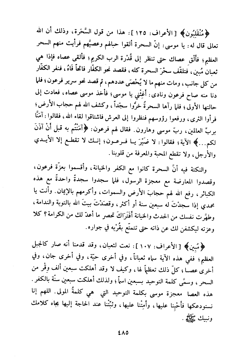 ثعبان مُبين، فتلقّف سحْرَ السحرة كله، فقصد نحو الكفَّار فاتحاً فَاهُ، فنفر الكفَّار من كل جانب، ومات منهم ما لا يُحْصَى عددهم، ثم قصد نحو سرير فرعون، فلما دنا منه صاح فرعون ونادى: أغِثْني يا موسى، فأخذ موسى عصاه، فعادت إلى حالتها الأولى، فلما رآها السحرة خرّوا سجّداً، وكشف الله لهم حجاب الأرض، فرأوا الثرى، ورفعوا رؤوسهم فنظروا إلى العرش (1) فاشتاقوا للقاء الله، فقالوا: آمَنَّا بربَ العالمين، ربّ موسى وهارون.