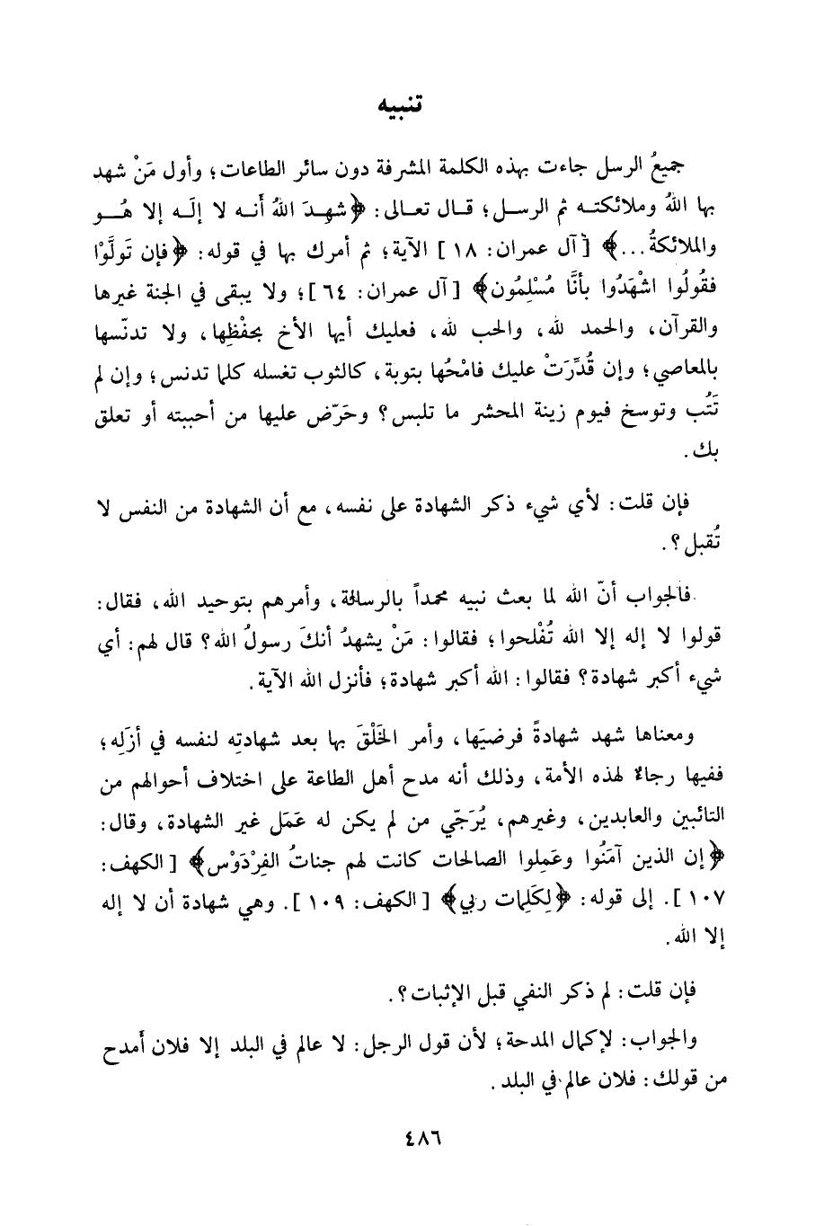 ثم أمرك بها في قوله: (فإن تَولَوْا فقولوا اشْهَدوا بأنَّا مسْلِمون) ، ولا يبقى في الجنة غيرها والقرآن، والحمد للَه، والحب للهِ، فعليك أيها الأخ بحفْظِها، ولا تدنِّسها بالمعاصي، وإن قُدِّرَتْ عليك فامْحها بتوبة، كالثوب تغسله كلما تدنس، وإن لم تتب وتوسخ فيوم زينة الحشر ما تلبس، وحَرّض عليها من أحببته أو تعلق بك.