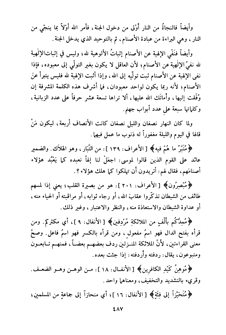 نفى الإلهية عن الأصنام ثبت تولِّيه إلى الله، وإذا أثبت الإلهية للهِ فليس يتبرأ عن الأصنام، لأنه ربما يكون لواحد معبودان، فما أشرف هذه الكلمة المشرفة إن وُفِّقت إليها، وأماتَك الله عليها، ألا تراها تسعة عشر حرفاً على عدد الزبانية، وكلماتها سبعة علي عدد أبواب جهنم.