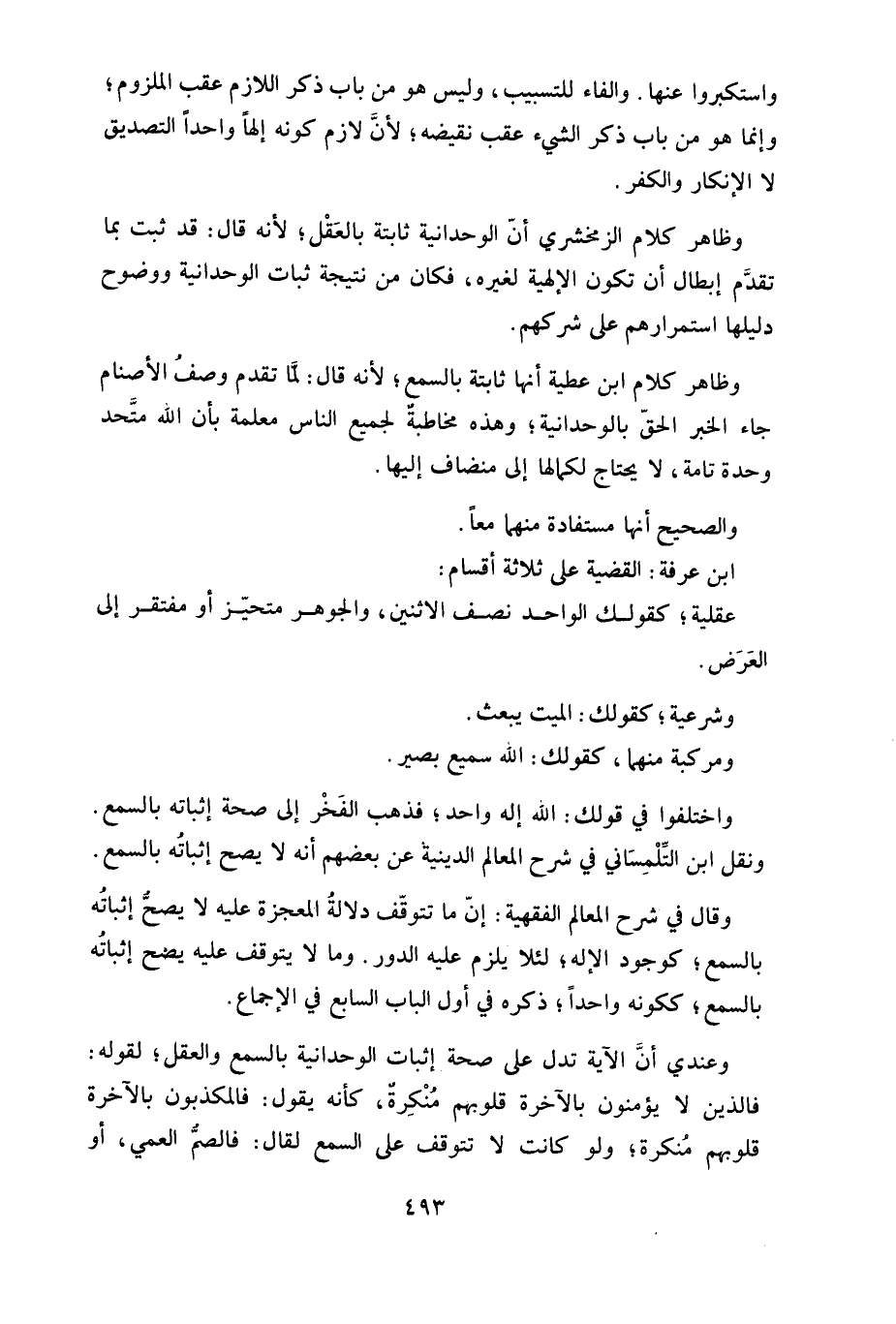 واختلفوا في قولك: الله إله واحد، فذهب الفَخْر إلى صحة إثباته بالسمع.
