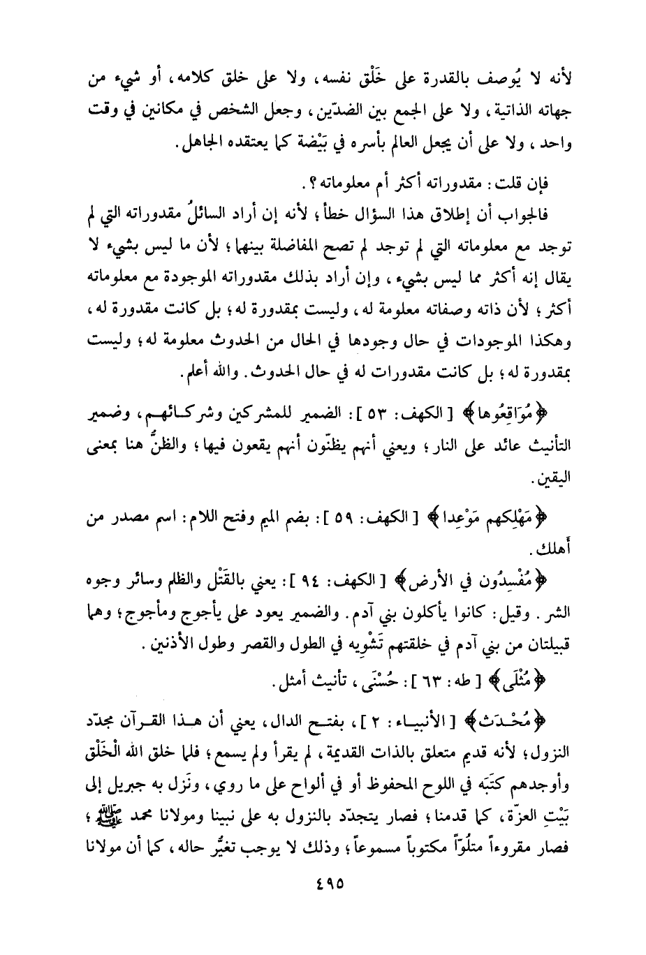 توجد مع معلوماته التي لم توجد لم تصح المفاضلة بينهما، لأن ما ليس بشيء لا يقال إنه أكثر مما ليس بشيء، وإن أراد بذلك مقدوراته الموجودة مع معلوماته أكثر، لأن ذاته وصفاته معلومة له، وليست بمقدورة له، بل كانت مقدورة له، وهكذا الموجودات في حال وجودها في الحال من الحدوث معلومة له، وليست بمقدورة له، بل كانت مقدورات له في حال الحدوث.