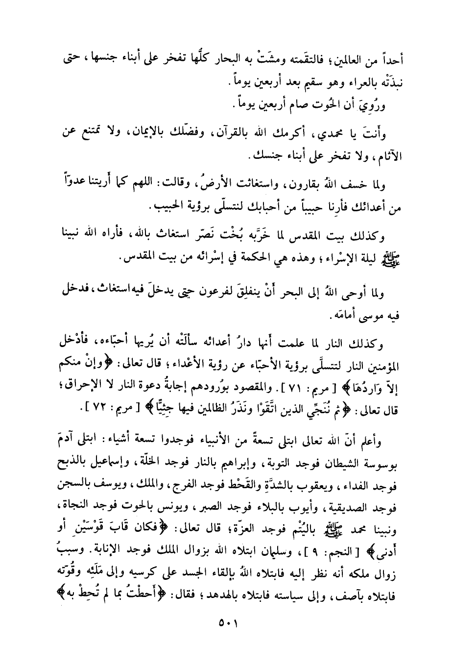 ابتلى آدمَ بوسوسة الشيطان فوجد التوبة، وإبراهيم بالنار فوجد الخلّة، وإسماعيل بالذبح فوجد الفداء، ويعقوب بالشدَّةِ والقَحْط فوجد الفرج، والملك، ويوسف بالسجن فوجد الصديقية، وأيوب بالبلاء فوجد الصبر، ويونس بالحوت فوجد النجاة، ونبينا محمدا - صلى الله عليه وسلم - باليتْم فوجد العزّة، قال تعالى: (فكان قَابَ قَوْسَيْنِ أو أدنى) .