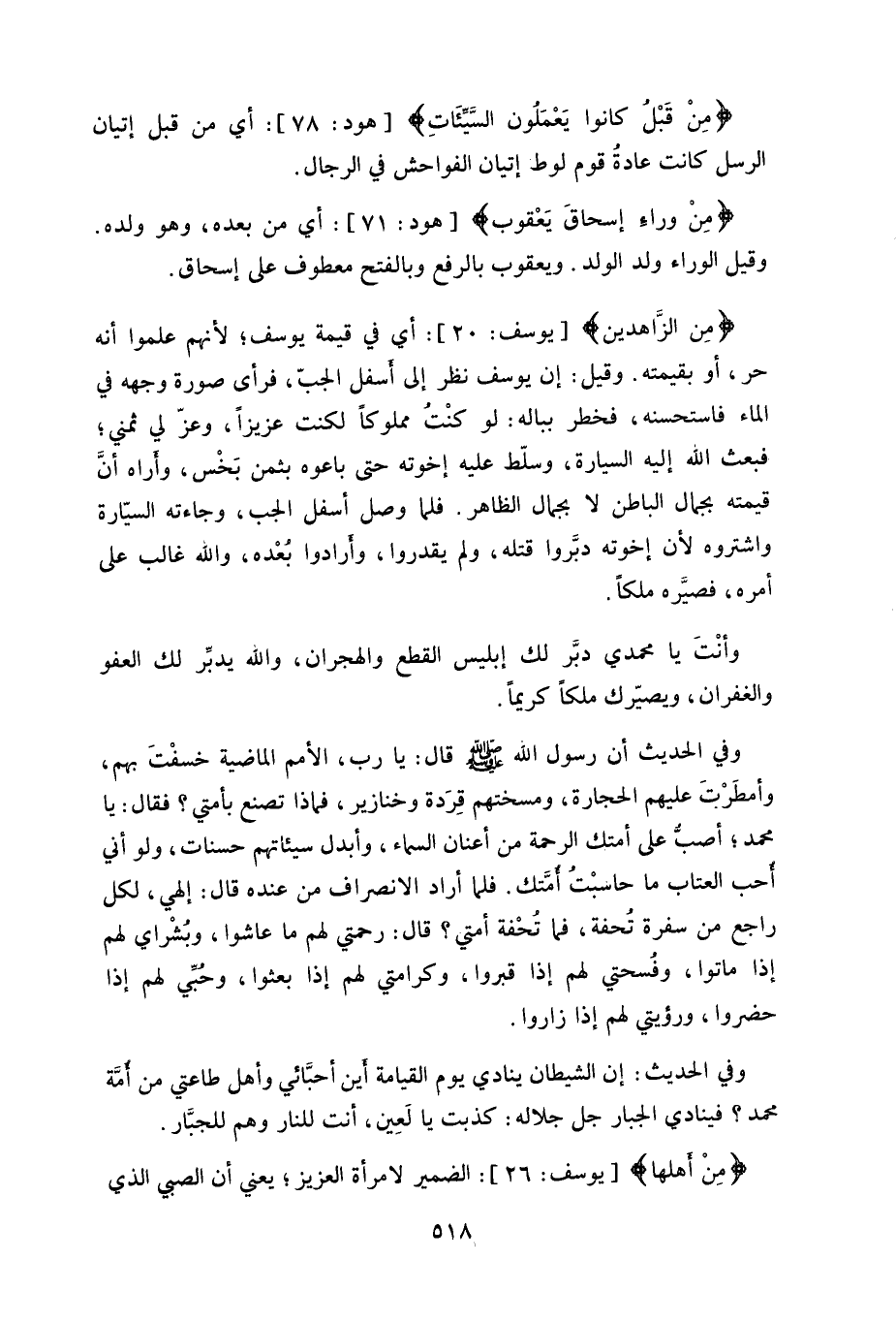 فلما أراد الانصراف من عنده قال: إلهي، لكل راجع من سفرة تُحفة، فما تحْفة أمتي، قال: رحمتي لهم ما عاشوا، وبُشْراي لهم إذا ماتوا، وفُسحتي لهم إذا قبروا، وكرامتي لهم إذا بعثوا، وحُبِّي لهم إذا حضروا، ورؤيتي لهم إذا زاروا.