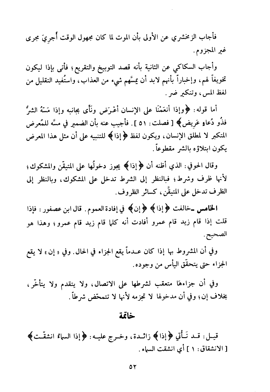 وأجاب السكاكي عن الثانية بأنه قصد التوبيخ والتقريع، فأتى بإذا ليكون
