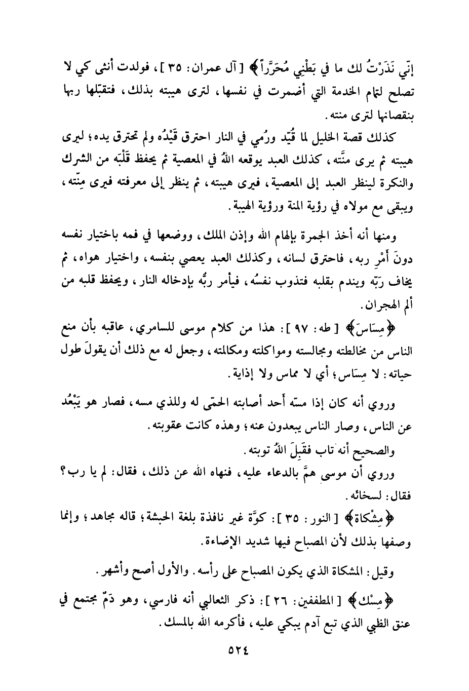دونَ أمْرِ ربه، فاحترق لسانه، وكذلك العبد يعصي بنفسه، واختيار هواه، ثم يخاف رَبّه ويندم بقلبه فتذوب نفسُه، فيأمر ربّه بإدخاله النار، ويحفظ قلبه من ألم الهجران.