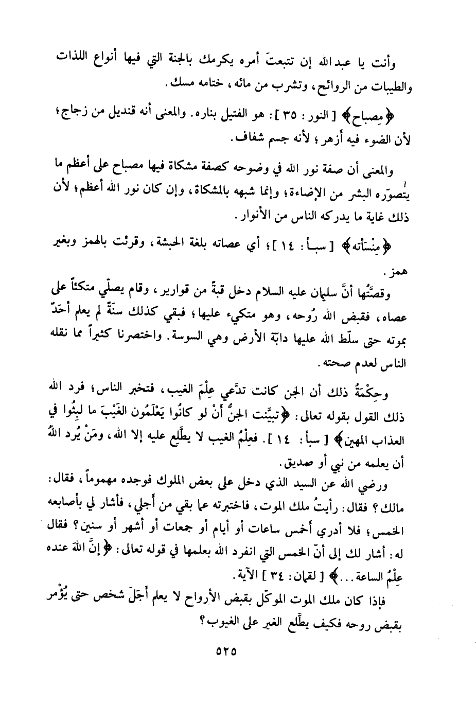 مالك، فقال: رأيتُ ملك الموت، فاختبرته عما بقي من أجلي، فأشار لي بأصابعه الخمس، فلا أدري أخمس ساعات أو أيام أو جمعات أو أشهر أو سنين، فقال له: أشار لك إلى أنَّ الخمس التي انفرد الله بعلمها في قوله تعالى: (إنَّ اللهَ عنده عِلْمُ الساعة ... ) الآية.