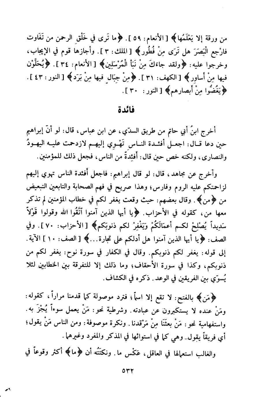 وقال في الكفار في سورة نوح: (يغفر لكم من ذنوبكم) ، وكذا في سورة الأحقاف، وما ذلك إلا للتفرقة بين الخطابين، لئلا يسوّي بين الفريقين في الوعد. ذكره في الكشاف.