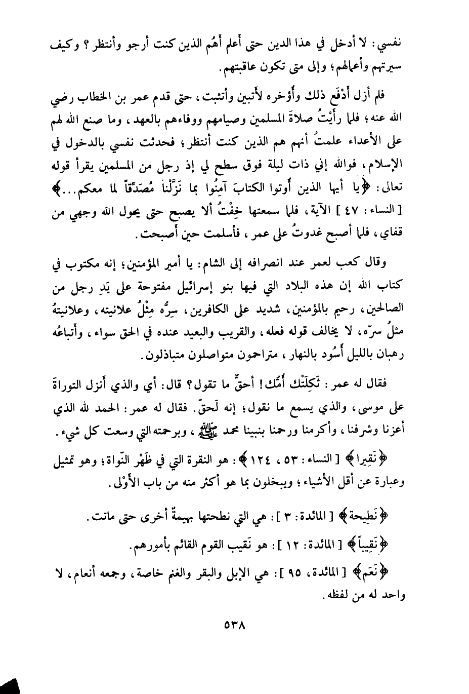 الله عنه، فلما رأيْتُ صلاةَ المسلمين وصيامهم ووفاءهم بالعهد، وما صنع الله لهم على الأعداء علمتُ أنهم هم الذين كنت أنتظر، فحدثت نفسي بالدخول في الإسلام، فوالله إني ذات ليلة فوق سطح لي إذ رجل من المسلمين يقرأ قوله تعالى: (يَا أَيُّهَا الَّذِينَ أُوتُوا الْكِتَابَ آمِنُوا بِمَا نَزَّلْنَا مُصَدِّقًا لِمَا مَعَكُمْ مِنْ قَبْلِ أَنْ نَطْمِسَ وُجُوهًا فَنَرُدَّهَا عَلَى أَدْبَارِهَا أَوْ نَلْعَنَهُمْ كَمَا لَعَنَّا أَصْحَابَ السَّبْتِ) ، فلما سمعتها خِفْتُ ألا يصبح حتى يحول الله وجهي من