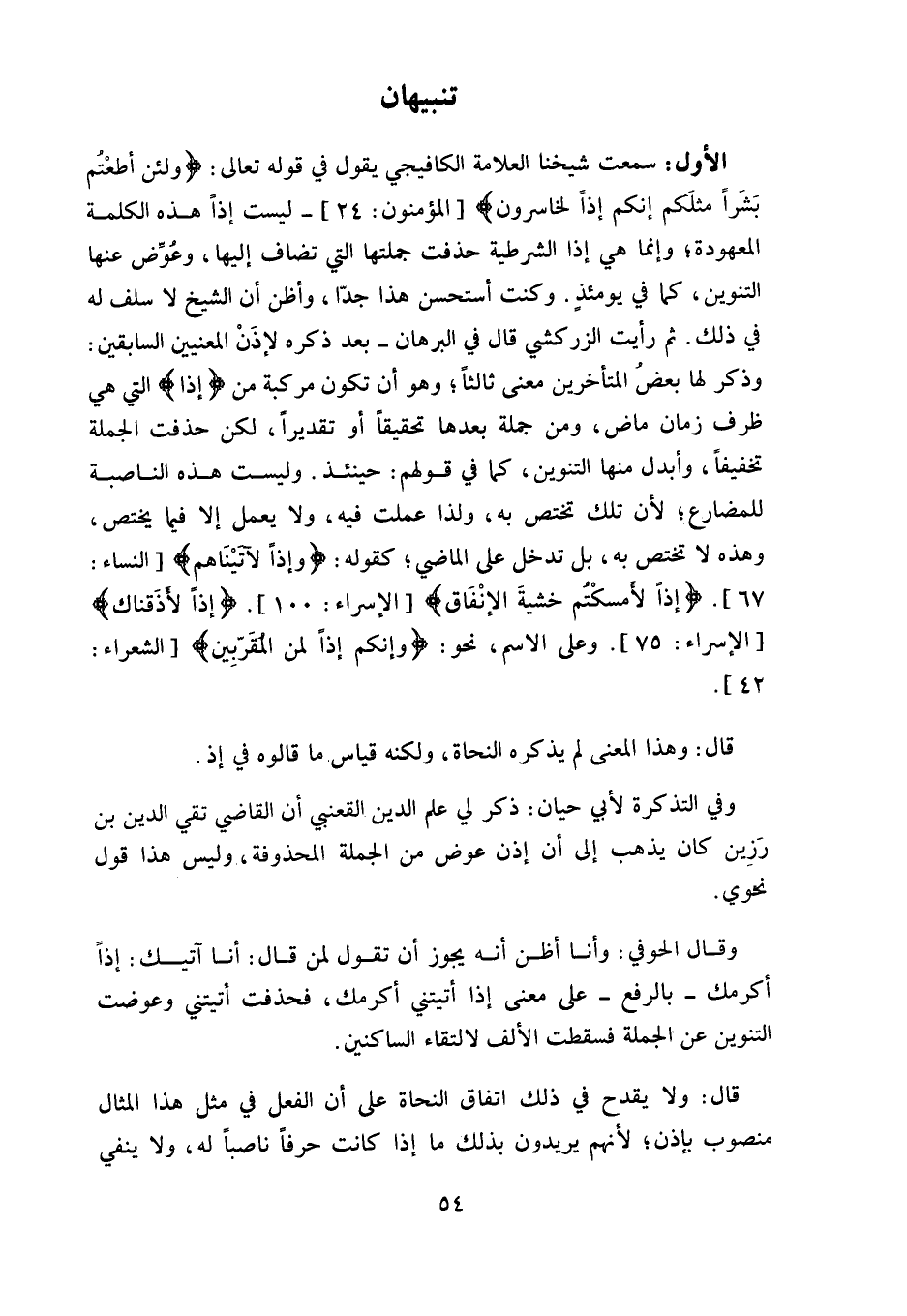 - ليست إِذًا هذه الكلمة المعهودة، وإنما هي إذا الشرطية حذفت جملتها التي تضاف إليها، وعُوِّض عنها التنوين، كما في يومئذٍ.