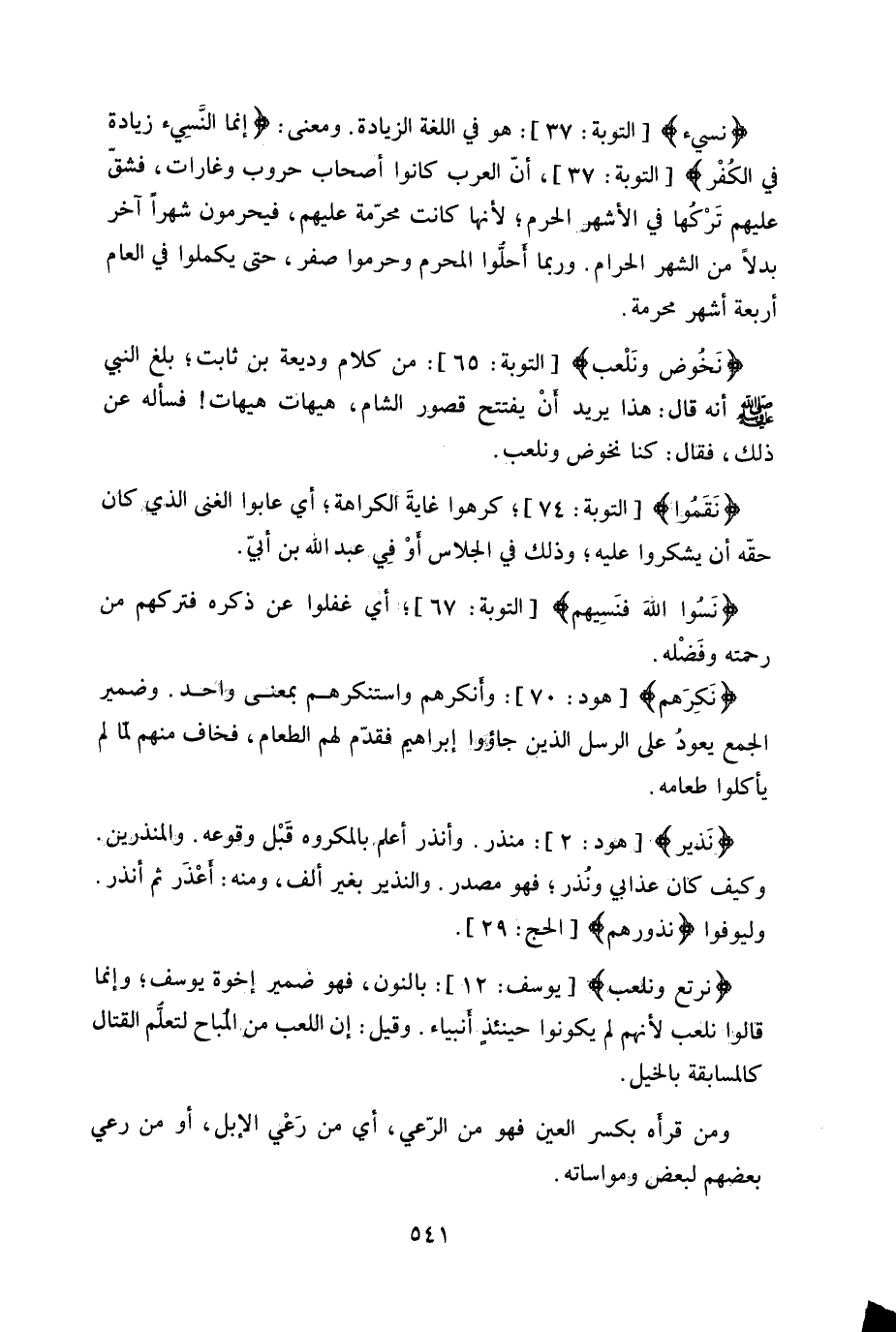 ومعنى: (إنما النَّسِيء زيادة في الكفْر) ، أنَّ العرب كانوا أصحاب حروب وغارات، فشقّ عليهم تَرْكها في الأشهر الحرم، لأنها كانت محرّمة عليهم، فيحرمون شهراً آخر بدلاً من الشهر الحرام.