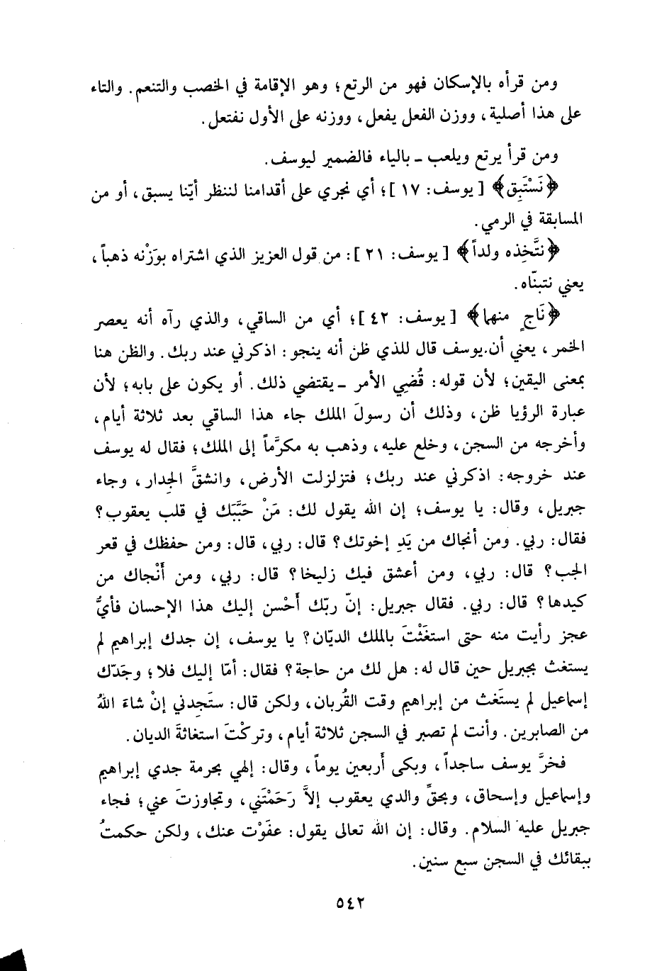 (1) كلام لا وزن له؛ لما فيه من افتراء على نبي الله يوسف - عليه السلام - والصحيح عند المحققين أن الضمير في قوله تعالى (فَأَنْسَاهُ الشَّيْطَانُ ذِكْرَ رَبِّهِ) يعود على الذي نجا منهما، وكيف يتصور عوده على يوسف - عليه السلام - وهو لم يغفل عن ذكر ربه طرفة عين، بل سأل الله النجاة من كيد النسوة ولو بالسجن (قَالَ رَبِّ السِّجْنُ أَحَبُّ إِلَيَّ مِمَّا يَدْعُونَنِي إِلَيْهِ) وعندما جاءه رسول الملك لم يبادر بالخروج بل قال: (ارْجِعْ إِلَى رَبِّكَ فَاسْأَلْهُ مَا بَالُ النِّسْوَةِ اللَّاتِي قَطَّعْنَ أَيْدِيَهُنَّ إِنَّ رَبِّي بِكَيْدِهِنَّ عَلِيمٌ) .
