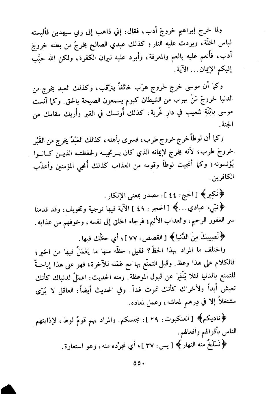 وكما أن لوطاً خرج خروج طرب، فسرى بأهله، كذلك العَبْد يخرج من القَبْر خروجَ طرب، لأنه يخرج لإيمانه الذي كان يرتجيه ولحفظته الذين كانوا