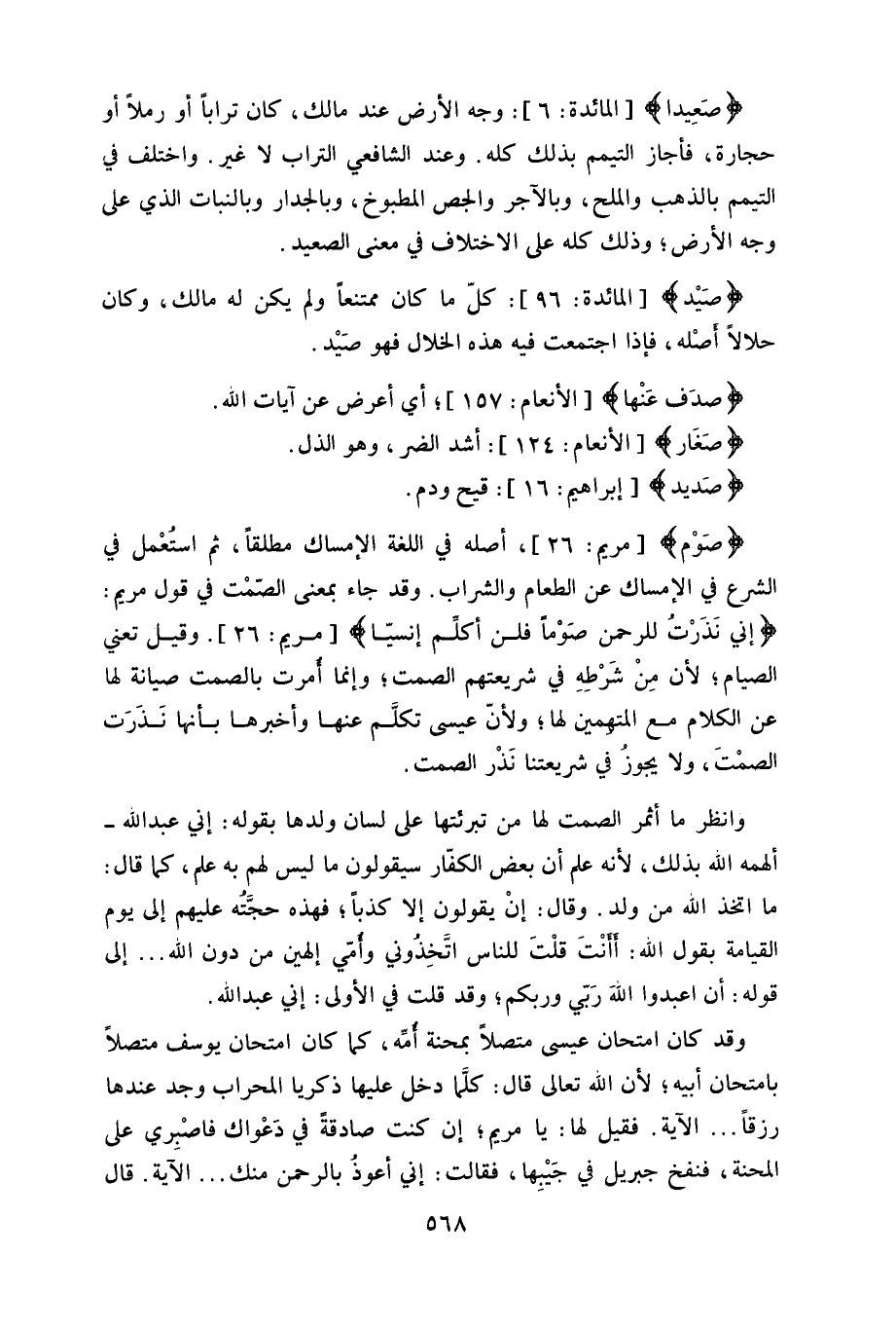 وقيل تعني الصيام، لأن مِنْ شَرْطِهِ في شريعتهم الصمت، وإنما أمرت بالصمت صيانة لها عن الكلام مع المتهمين لها، ولأنّ عيسى تكلَّم عنها وأخبرها بأنها نذَرَت الصمْتَ، ولا يجوزُ في شريعتنا نذْر الصمت.