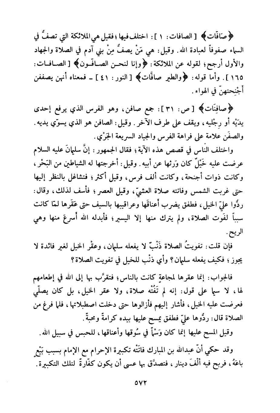 حتى غربت الشمس وفاتته صلاة العشيِّ، وقيل العصر، فأسف لذلك، وقال: ردّوا عليَّ الخيل، فطفق يضرب أعناقَهها وعراقيبها بالسيف حتى عَقَرها (1) لمّا كانت سبباً لفَوت الصلاة، ولم يترك منها إلا اليسير، فأبدله الله أسرعَ منها وهي الريح.