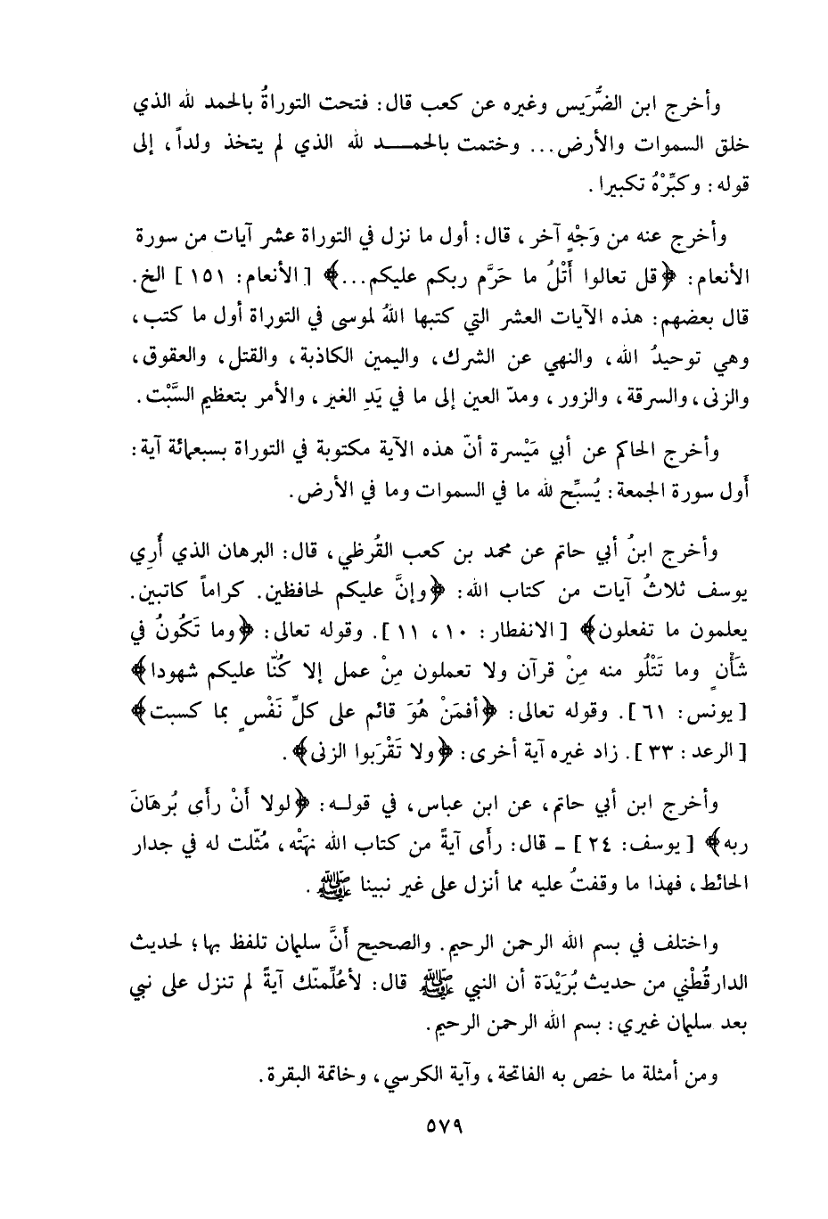وأخرج ابن الضّرَيس وغيره عن كعب قال: فتحت التوراةُ بـ (الحمد لله الذي خلق السماوات والأرض) .