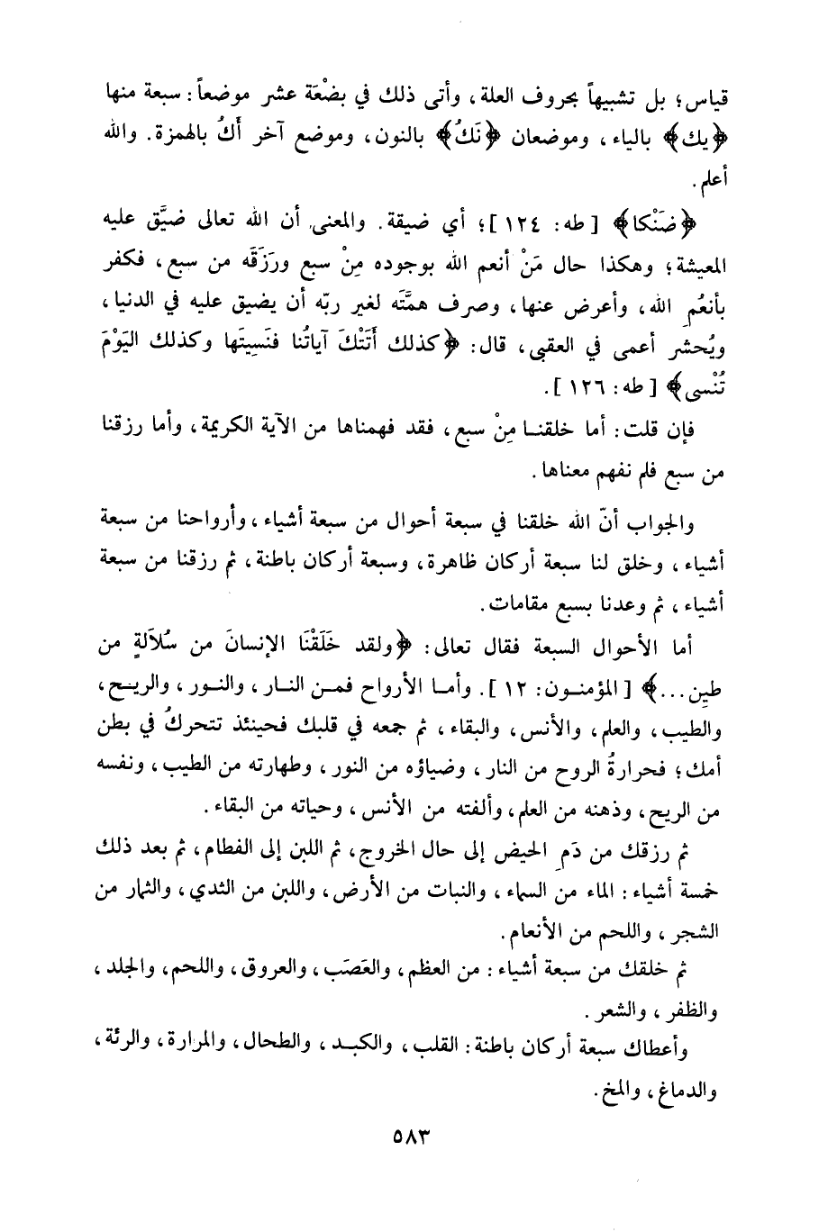 أشياء، وخلق لنا سبعة أركان ظاهرة، وسبعة أركان باطنة، ثم رزقنا من سبعة أشياء، ثم وعدنا بسبع مقامات.