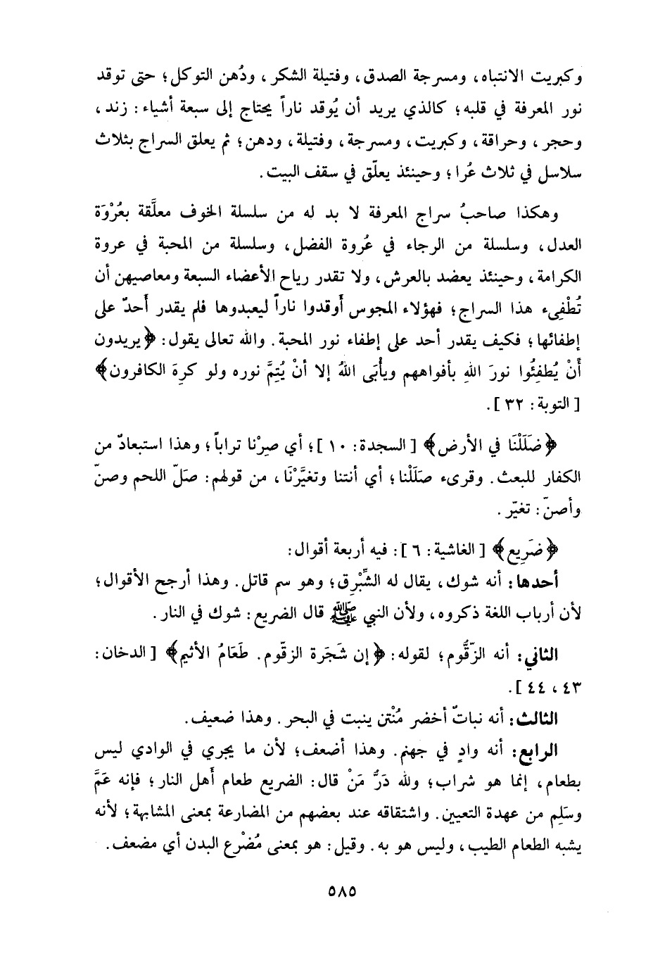 وكبريت الانتباه، ومسرجة الصدق، وفتيلة الشكر، ودهن التوكل، حتى توقد نور المعرفة في قلبه، كالذي يريد أن يوقد ناراً يحتاج إلى سبعة أشياء: زند، وحجر، وحراقة، وكبريت، ومسرجة، وفتيلة، ودهن، ثم يعلق السراج بثلاث سلاسل في ثلاث غرا، وحينئذ يعلّق في سقف البيت.