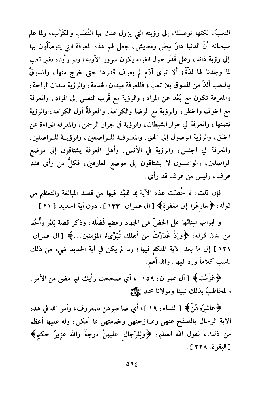 التعبُ، لكنها توصلك إلى رؤيته التي يزول عنك بها النَّصَب والكَرْب، ولما علم سبحانه أنَّ الدنيا دار مِحَن ومعايش، جعل لهم هذه المعرفة التي يتوصَّلُون بها إلى رؤية ذاته، وعلى قَدْر طول الغربة يكون سرور الأوْبة، ولو رأيناه بغير تعب لما وجدنا لها لذّةً، ألا ترى آدَم لم يعرف قدرها حتى خرج منها، والمسوقُ بالتعب ألذّ من المسوق بلا تعب، فالمعرفة ميدان الخدمة، والرؤية ميدان الراحة، والمعرفة تكون مع بُعْد عن المراد، والرؤية مع قرب النفس إلى المراد، والمعرفة مع الخوف والخطر، والرؤية مع الرضا والكرامة.