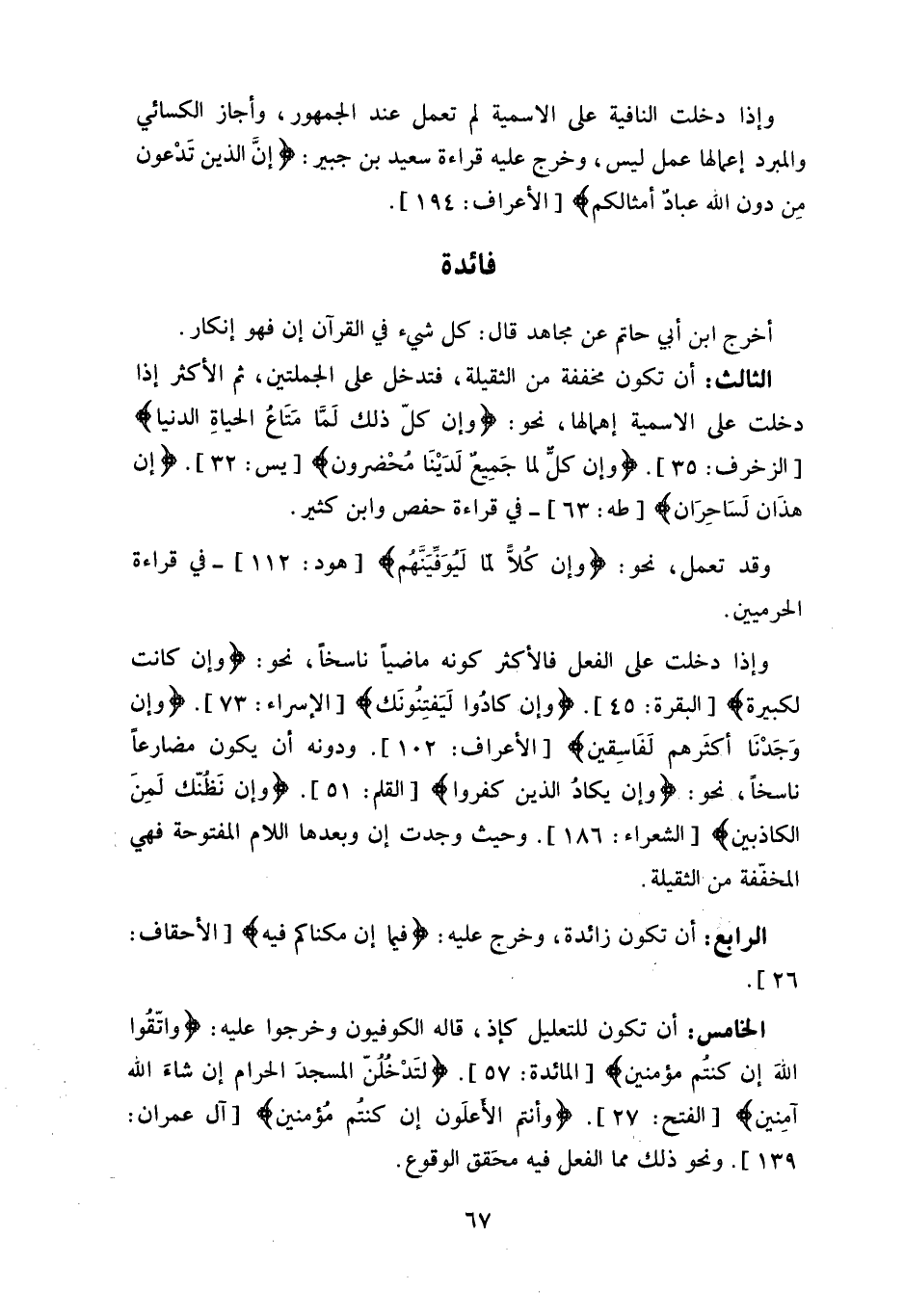 والمبرد إعمالها عمل ليس، وخرج عليه قراءة سعيد بن جبير: (إنَّ الذين تَدْعون مِن دون الله عبادٌ أمثالكم) .