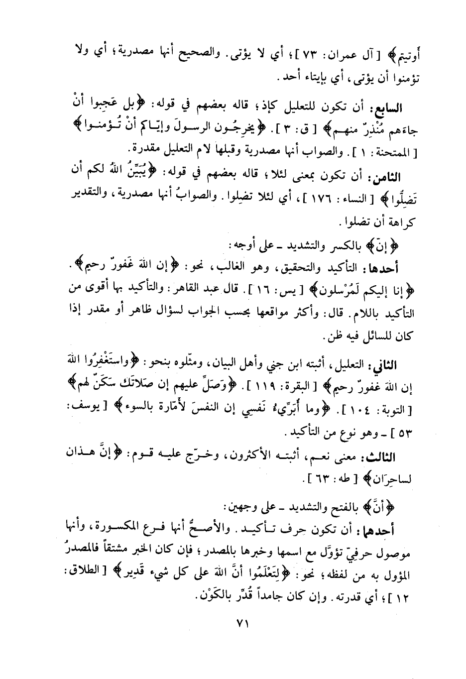 والأصحّ أنها فرع المكسورة، وأنها موصول حرفِيّ تؤوَّل مع اسمها وخبرها بالمصدر، فإن كان الخبر مشتقاً فالمصدر المؤول به من لفظه، نحو: (لِتَعْلَموا أنَّ اللهَ على كل شيء قَدِير) .، أي قدرته.