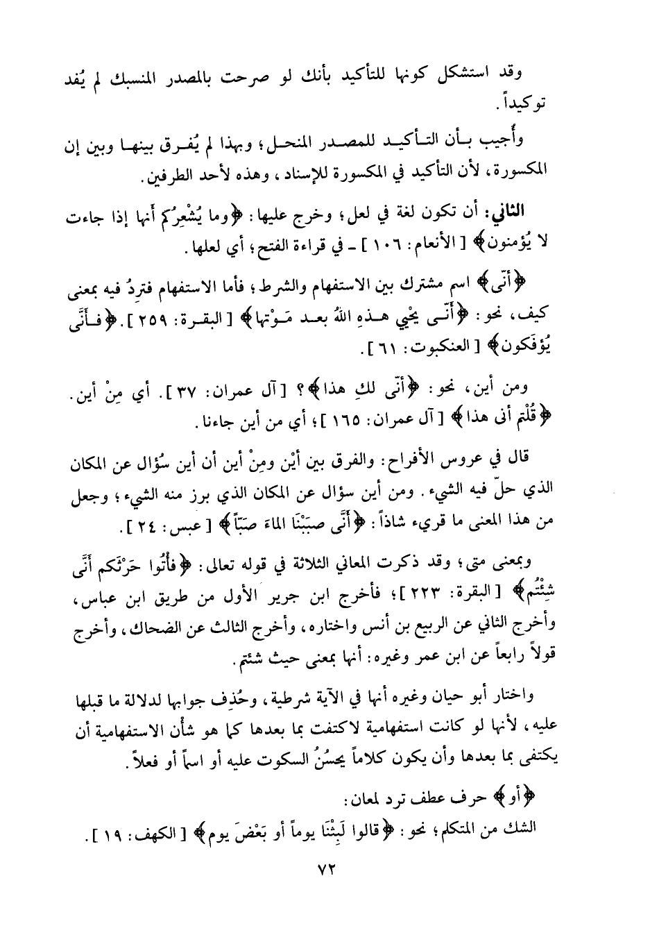 وبمعنى متى، وقد ذكرت المعاني الثلاثة في قوله تعالى: (فأتوا حَرْثَكم أنَّى