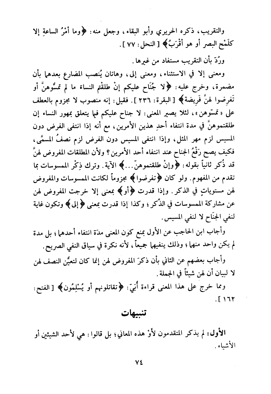 فقيل: إنه منصوب لا مجزوم بالعطف على "تَمَسُّوهُنَّ"، لئلا يصير المعنى: لا جناح عليكم فما يتعلق بمهور النساء إن طلقتموهنَّ في مدة انتفاء أحدِ هذين الأمرين، مع أنه إذا انتفى الفرض دون المسيس لزم مهر المثل، وإذا انتفى السيس دون الفرض لزم نص@ السقَى.