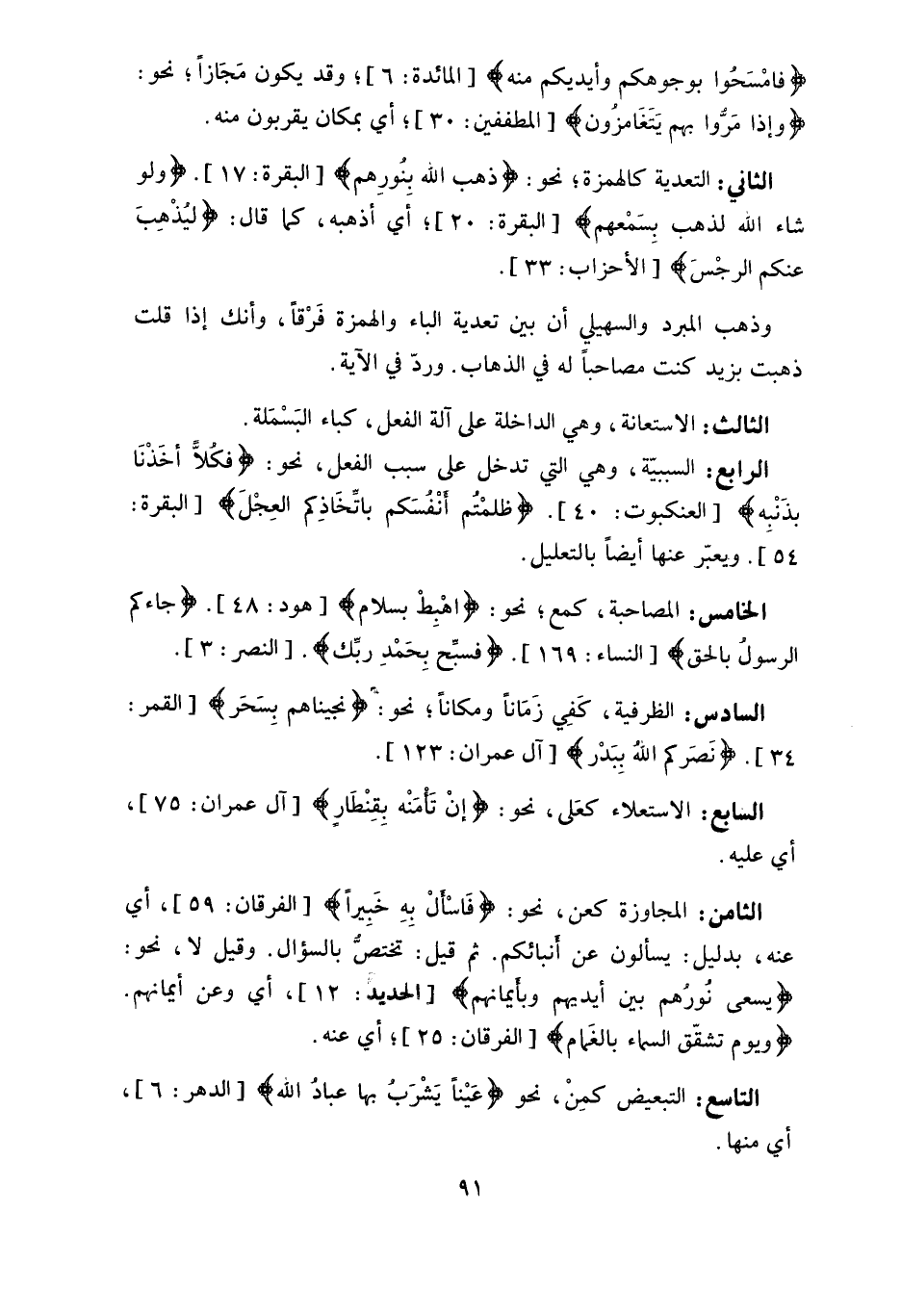 الثامن: المجاوزة كعن، نحو: (فَاسْألْ بِهِ خَبِيراً) ، أي عنه، بدليل: يسألون عن أنبائكم.