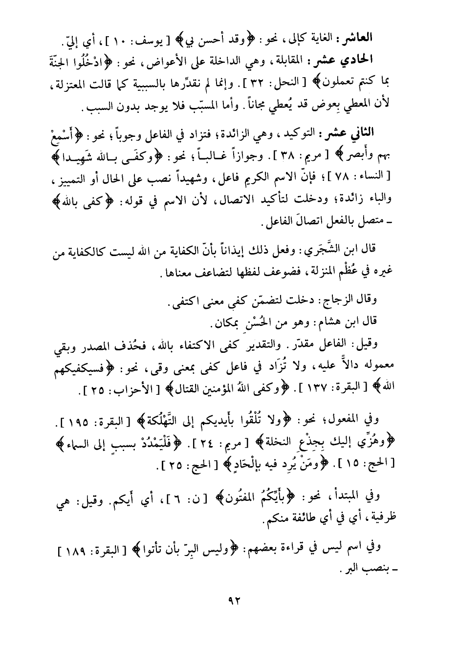 معموله دالاًّ عليه، ولا تزَاد في فاعل كفى بمعنى وقى، نحو: (فسيكفيكهم