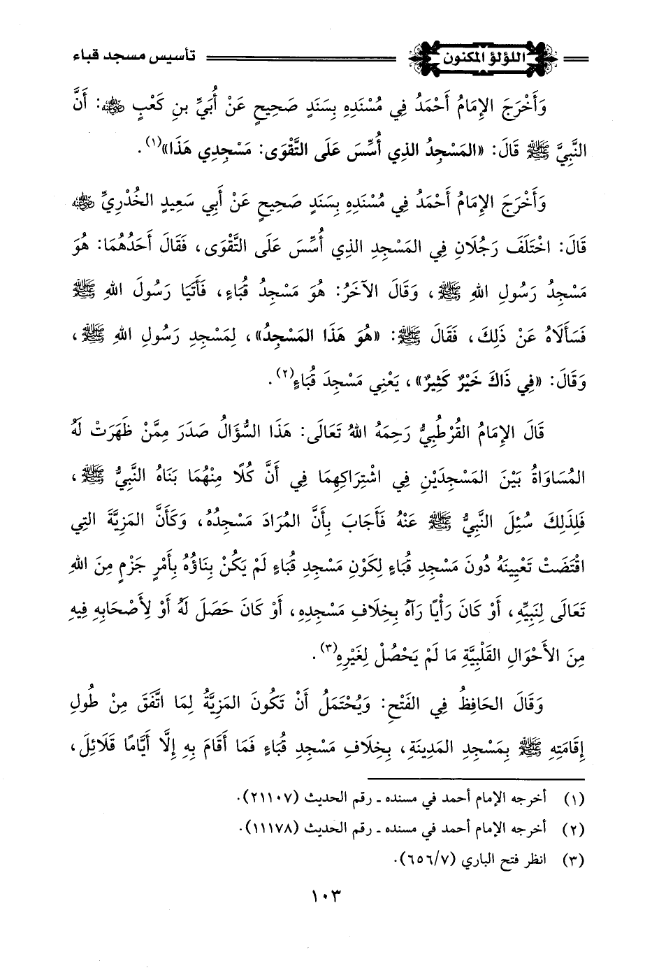وَأَخْرَج الإِمَامُ أَحْمَدُ فِي مُسْنَدِهِ بِسَنَدٍ صَحِيحٍ عَنْ أَبِي سَعِيدٍ الخُدْرِيِّ -رضي اللَّه عنه- قَالَ: اخْتَلَفَ رَجُلَانِ فِي المَسْجِدِ الذِي أُسِّسَ عَلَى التَّقْوَى، فَقَالَ أَحَدُهُمَا: هُوَ مَسْجِدُ رَسُولِ اللَّه -صلى اللَّه عليه وسلم-، وَقَالَ الآخَرُ: هُوَ مَسْجِدُ قباء، فَأَتَيَا رَسُولَ اللَّه -صلى اللَّه عليه وسلم- فَسَأَلَاهُ عَنْ ذَلِكَ، فَقَالَ -صلى اللَّه عليه وسلم-: "هُوَ هَذَا المَسْجِدُ"، لِمَسْجِدِ رَسُولِ اللَّه -صلى اللَّه عليه وسلم-، وَقَالَ: "فِي ذَاكَ خَيْرٌ كَثِيرٌ"، يَعْنِي مَسْجِدَ قُبَاءٍ (¬2).