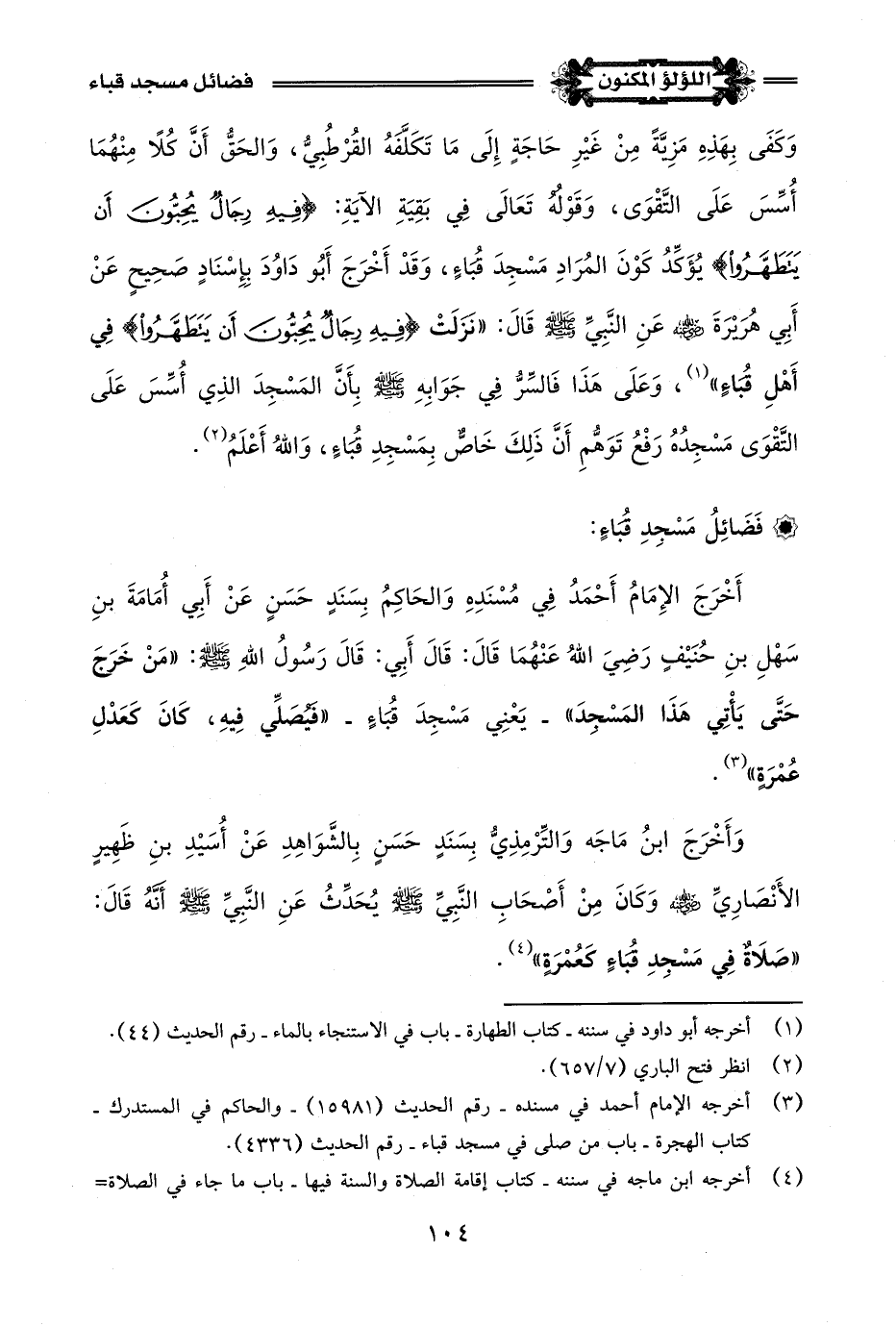 (¬3) أخرجه الإمام أحمد في مسنده - رقم الحديث (15981) - والحاكم في المستدرك - كتاب الهجرة - باب من صلى في مسجد قباء - رقم الحديث (4336).