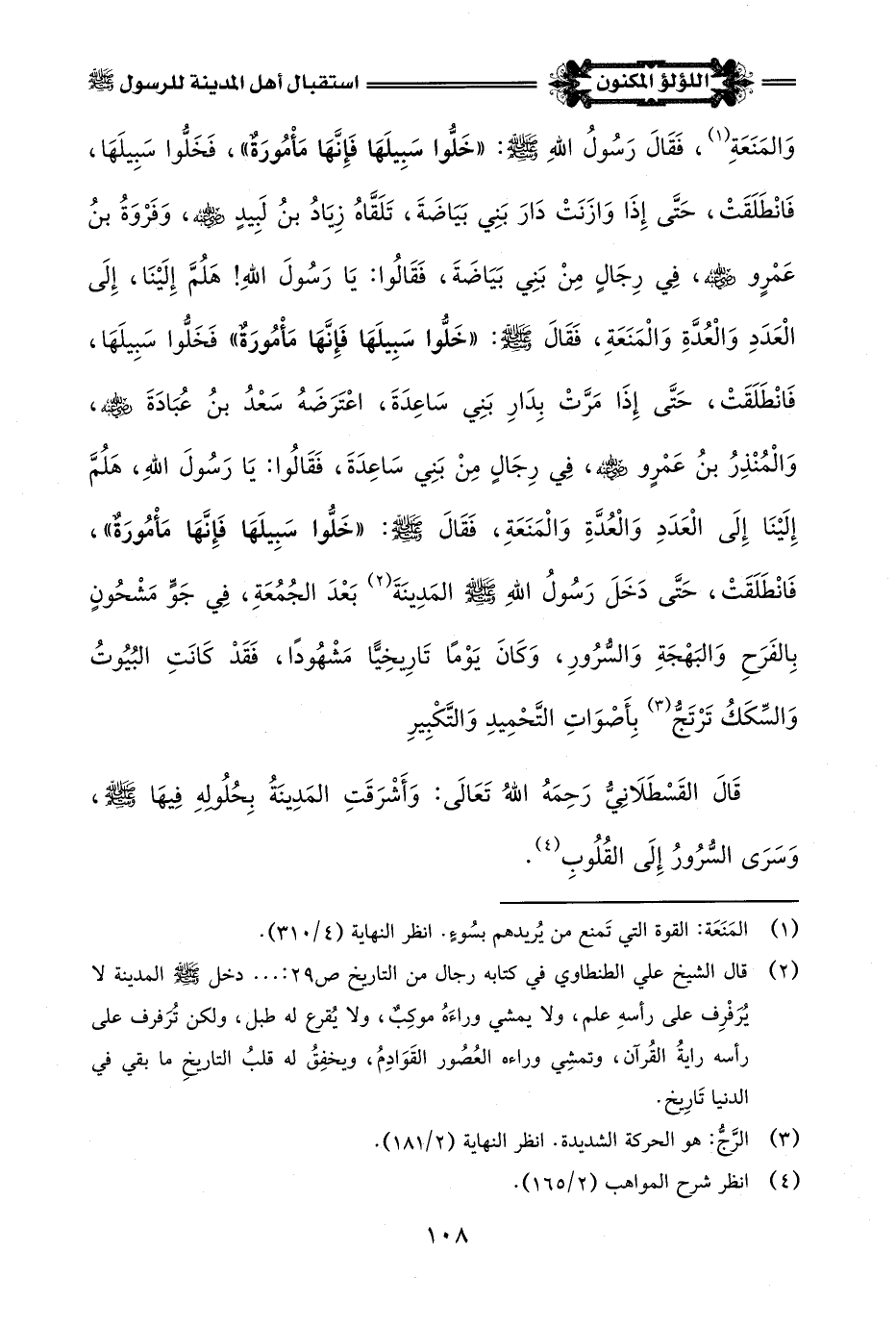 وَالمَنَعَةِ (¬1)، فَقَالَ رَسُولُ اللَّهِ -صلى اللَّه عليه وسلم-: "خَلُّوا سَبِيلَهَا فَإِنَّهَا مَأْمُورَةٌ"، فَخَلُّوا سَبِيلَهَا، فَانْطَلَقَتْ، حَتَّى إِذَا وَازَنَتْ دَارَ بَنِي بَيَاضَةَ، تَلَقَّاهُ زِيَادُ بنُ لَبِيدٍ -رضي اللَّه عنه-، وَفَرْوَةُ بنُ عَمْرٍو -رضي اللَّه عنه-، فِي رِجَالٍ مِنْ بَنِي بَيَاضَةَ، فَقَالُوا: يَا رَسُولَ اللَّه! هَلُمَّ إِلَيْنَا، إِلَى الْعَدَدِ وَالْعُدَّةِ وَالْمَنَعَةِ، فَقَالَ -صلى اللَّه عليه وسلم-: "خَلُّوا سَبِيلَهَا فَإِنَّهَا مَأْمُورَةٌ" فَخَلُّوا سَبِيلَهَا، فَانْطَلَقَتْ، حَتَّى إِذَا مَرَّتْ بِدَارِ بَنِي سَاعِدَةَ، اعْترَضَهُ سَعْدُ بنُ عُبَادَةَ -رضي اللَّه عنه-، وَالْمُنْذِرُ بنُ عَمْرٍو -رضي اللَّه عنه-، فِي رِجَالٍ مِنْ بَنِي سَاعِدَةَ، فَقَالُوا: يَا رَسُولَ اللَّه، هَلُمَّ إِلَيْنَا إِلَى الْعَدَدِ وَالْعُدَّةِ وَالْمَنَعَةِ، فَقَالَ -صلى اللَّه عليه وسلم-: "خَلُّوا سَبِيلَهَا فَإِنَّهَا مَأْمُورَةٌ"، فَانْطَلَقَتْ، حَتَّى دَخَلَ رَسُولُ اللَّه -صلى اللَّه عليه وسلم- المَدِينَةَ (¬2) بَعْدَ الجُمُعَةِ، فِي جَوٍّ مَشْحُونٍ بِالفَرَحِ وَالبَهْجَةِ وَالسُّرُورِ، وَكَانَ يَوْمًا تَارِيخِيًّا مَشْهُودًا، فَقَدْ كَانَتِ البُيُوتُ وَالسِّكَكُ تَرْتَجُّ (¬3) بِأَصْوَاتِ التَّحْمِيدِ وَالتَّكْبِيرِ.