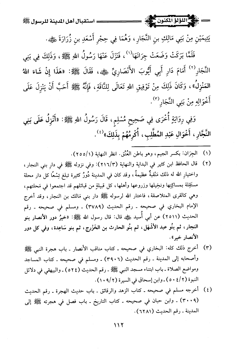 (¬2) قال الحافظ ابن كثير في البداية والنهاية (3/ 216): وفي نزوله -صلى اللَّه عليه وسلم- في دارِ بني النجار، واختيارِ اللَّه له ذلك مَنْقبةٌ عظيمةُ، وقد كان في المدينة دُورُ كثيرة تبلغ تِسْعًا كل دار محلة مستَقِلة بمساكِنِها ونخِيلها وزروعها وأهلها، كل قبيلةِ من قبائلهم قد اجتمعوا في مَحلتهم، وهي كالقرى المتلاصقة، فاختار اللَّه لرسوله -صلى اللَّه عليه وسلم- دار بني مَالك بن النجار، وقد أخرج الإمام البخاري في صحيحه - رقم الحديث (3789) - ومسلم في صحيحه - رقم الحديث (2511) عن أبي أُسيد -رضي اللَّه عنه- قال: قال رسول اللَّه -صلى اللَّه عليه وسلم-: "خيرُ دور الأنصار بنو النجار، ثم بنُو عبد الأشهَل، ثم بنُو الحارث بن الخَزْرج، ثم بنو سَاعِدة، وفي كل دور الأنصار خير".